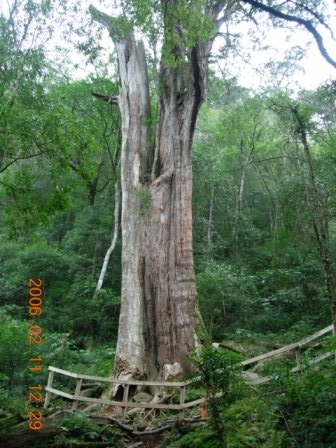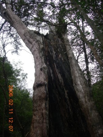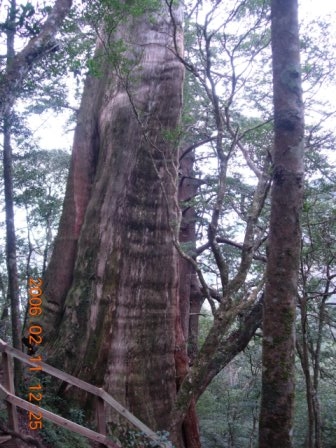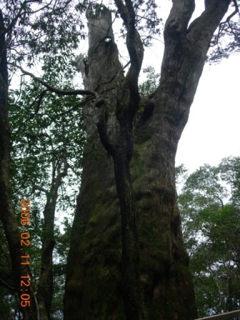 12:02 路左一棵遭雷擊過,僅剩半面的神木(編號:1號神木 ),又稱「半面神木」,仍生趣盎然。