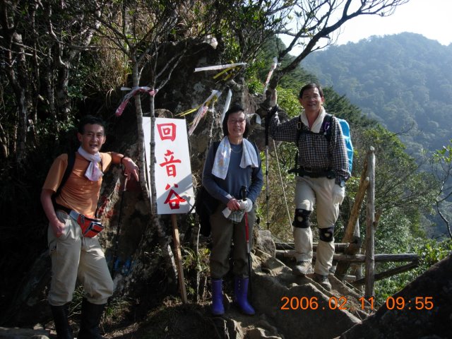 09:54 【稜線拉庫山叉路】,右往拉庫山,左往神木區、那結山、內鳥嘴山,取左循稜往內鳥嘴山續行。地上置有「回音谷」白底紅字木牌一只,山友們皆拉開嗓門,往前方山壁大喊,果然有回音迴盪於山谷間。取左前往內鳥嘴山,隨即遇岩稜,地勢險峻,架設了三段木梯,以便山友們通過。