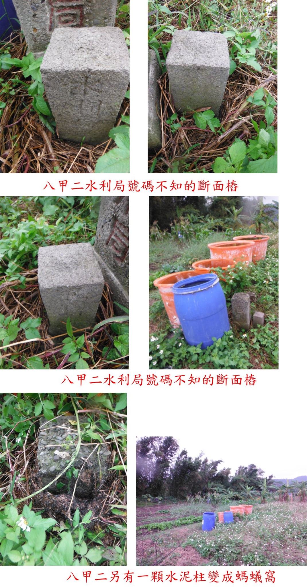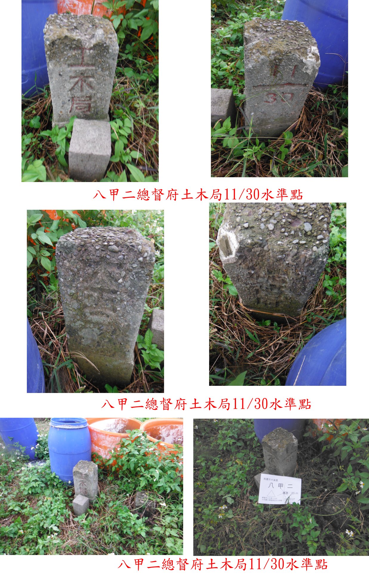 取左巷道走170公尺,左轉水泥溝渠走60公尺,右側的菜園內見到八甲二土木局11/30水準點,旁還有一顆水利局的斷面樁,另還有一顆水利局早期的水泥柱,變成螞蟻窩;三顆基石併排,於菜園內紅、藍大水桶旁。