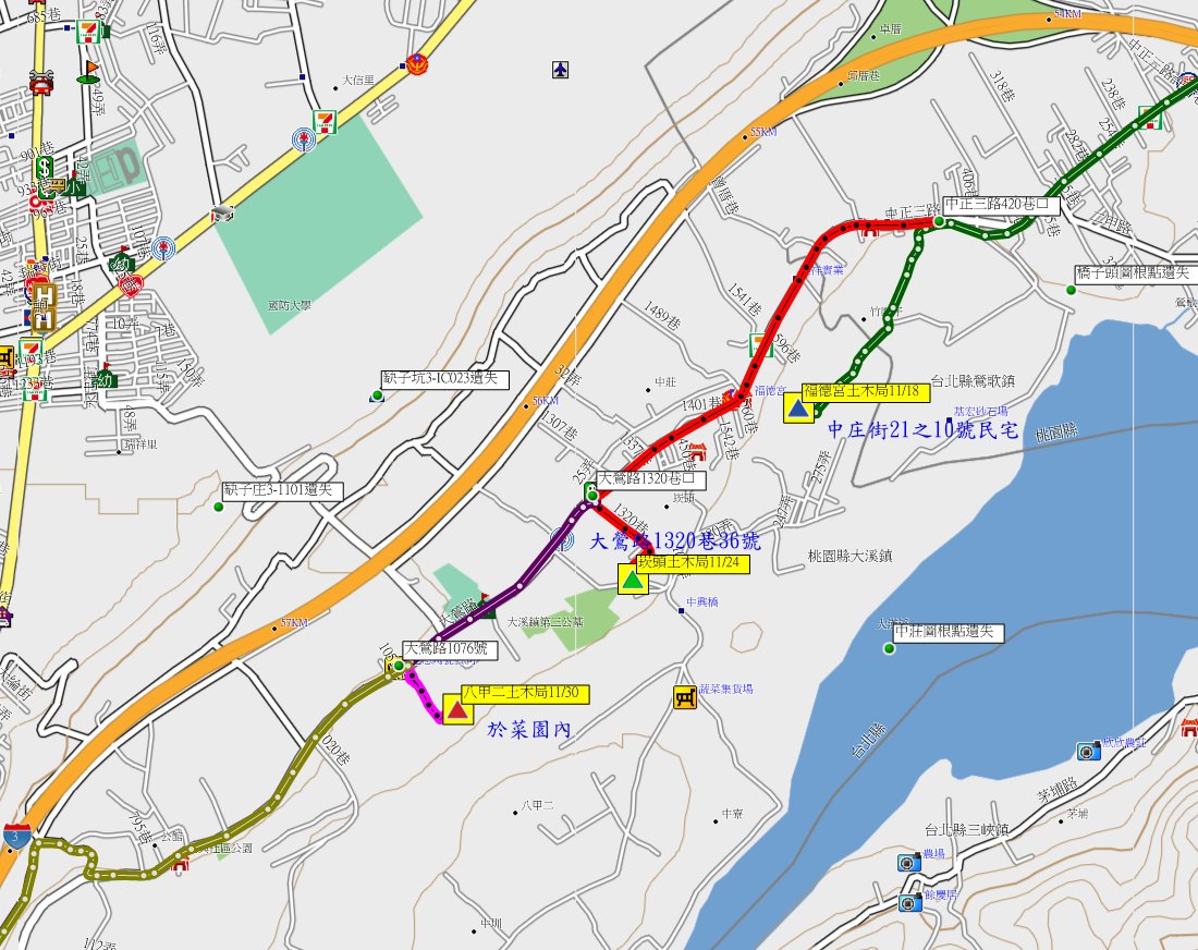 由福德宮回原路至中正三路420巷口,左轉桃60線(大鶯路)往南走1K叉路,左轉大鶯路1320巷走230公尺,左轉走60公尺停車於大鶯路1320巷36號民宅前。