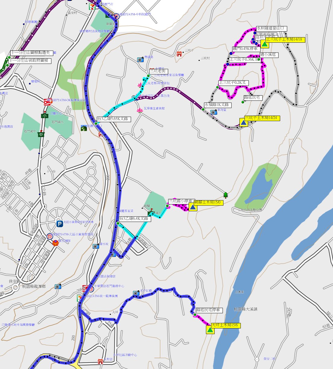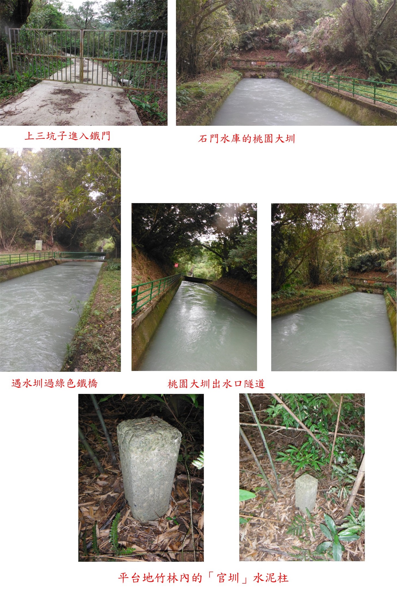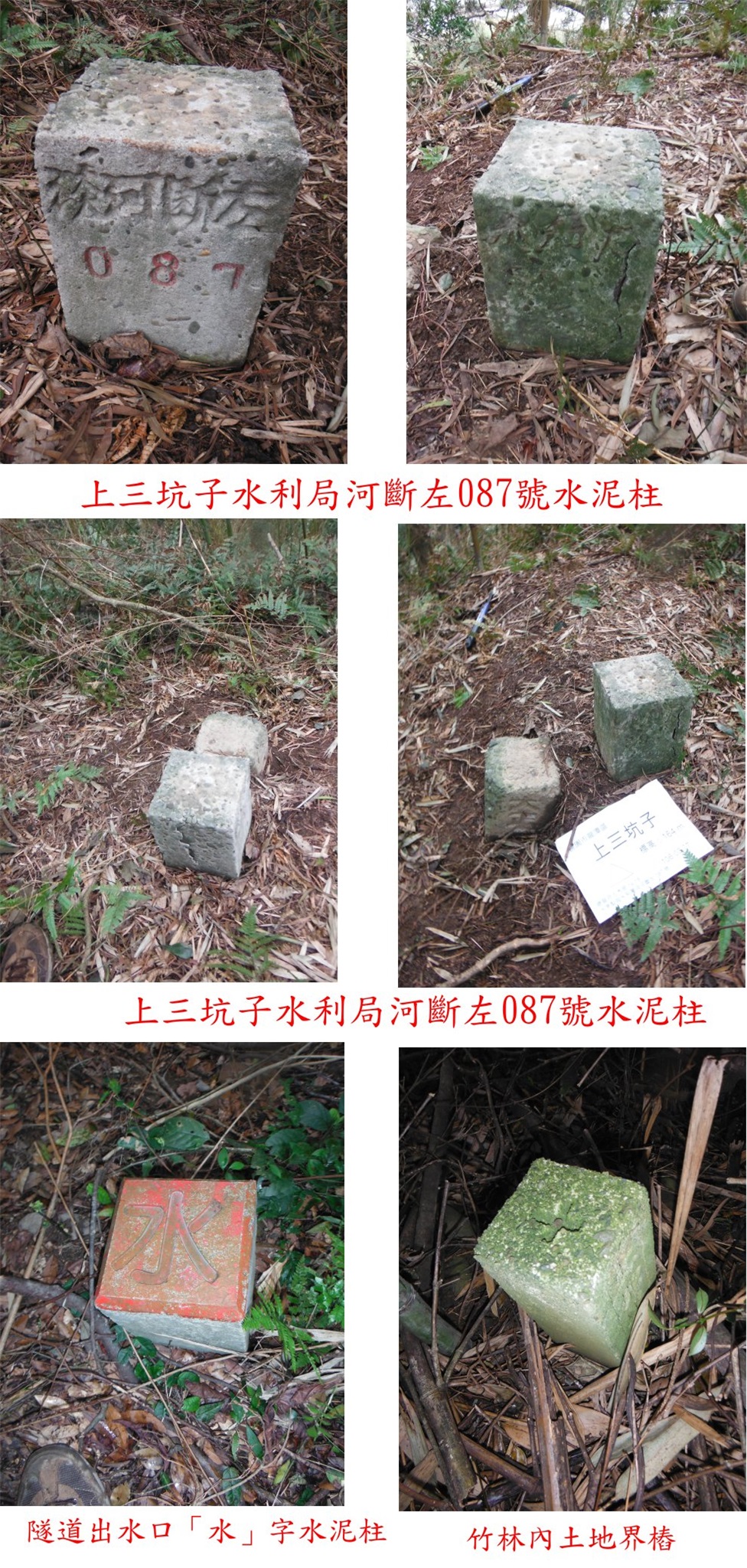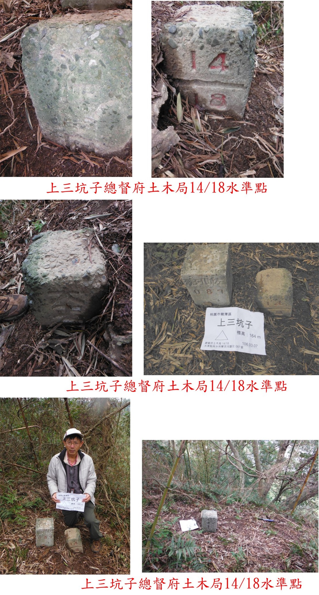 走路繞過鐵門下坡走240公尺遇水圳,過綠色鐵橋後右轉走20公尺至桃園大圳出水口隧道,出水口有數顆「水」字水泥柱;取右跟隨路條陡上走4分鐘上至平台地,進入竹林沿途經過「官圳」水泥柱與土地界樁,還好山友砍過不然此段要苦戰,竹林內走6分鐘抵達上三坑子土木局14/18水準點,旁另有水利局河斷左087號水泥柱;基石於崖邊,可俯瞰下方的自行車道,去程走14分鐘,往返費時33分鐘,自行找路白白浪費一小時;找完此基石至三坑的老街吃午餐。