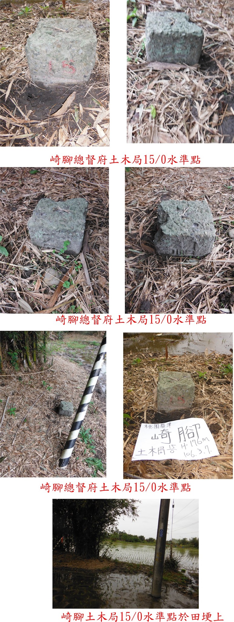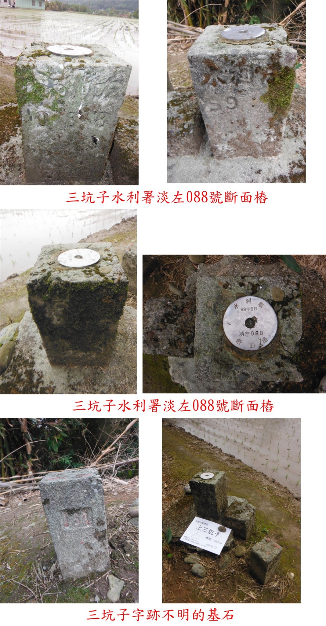 取民宅圍牆外的稻田走36公尺,即見到崁頭土木局11/24水準點,旁還有水利局淡河070號斷面樁,另還有一顆破損的水泥柱、應是水利局早期所立;基石於田埂旁靠近墳墓處,三顆基石併排。