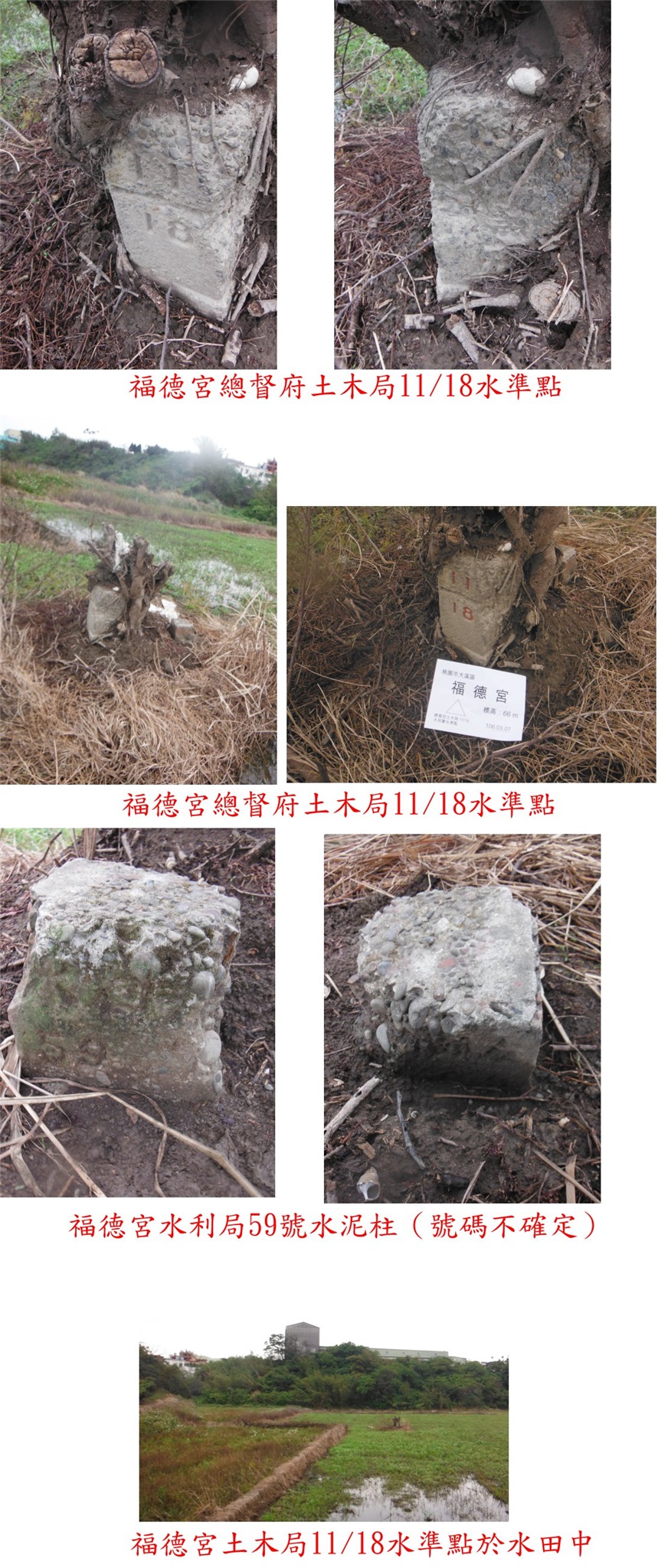 至路底取右田埂走35公尺,福德宮土木局11/18水準點於右側的水田中,離田埂約2公尺,基石被枯樹頭包覆只能看到二面,旁還有顆水利局59號水泥柱(號碼不確定);水田走水泥濘,基石處有許多會咬人的螞蟻。