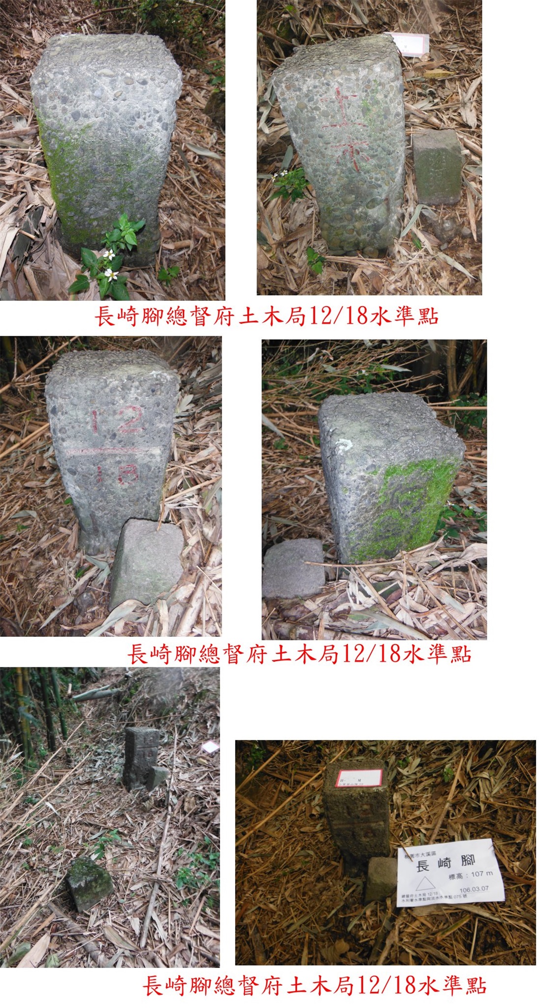 6、長崎腳:位於桃園市大溪區,標高103公尺,總督府土木局12/18水準點、水利署水準點與淡水水準點075號;座標278639 2755617。