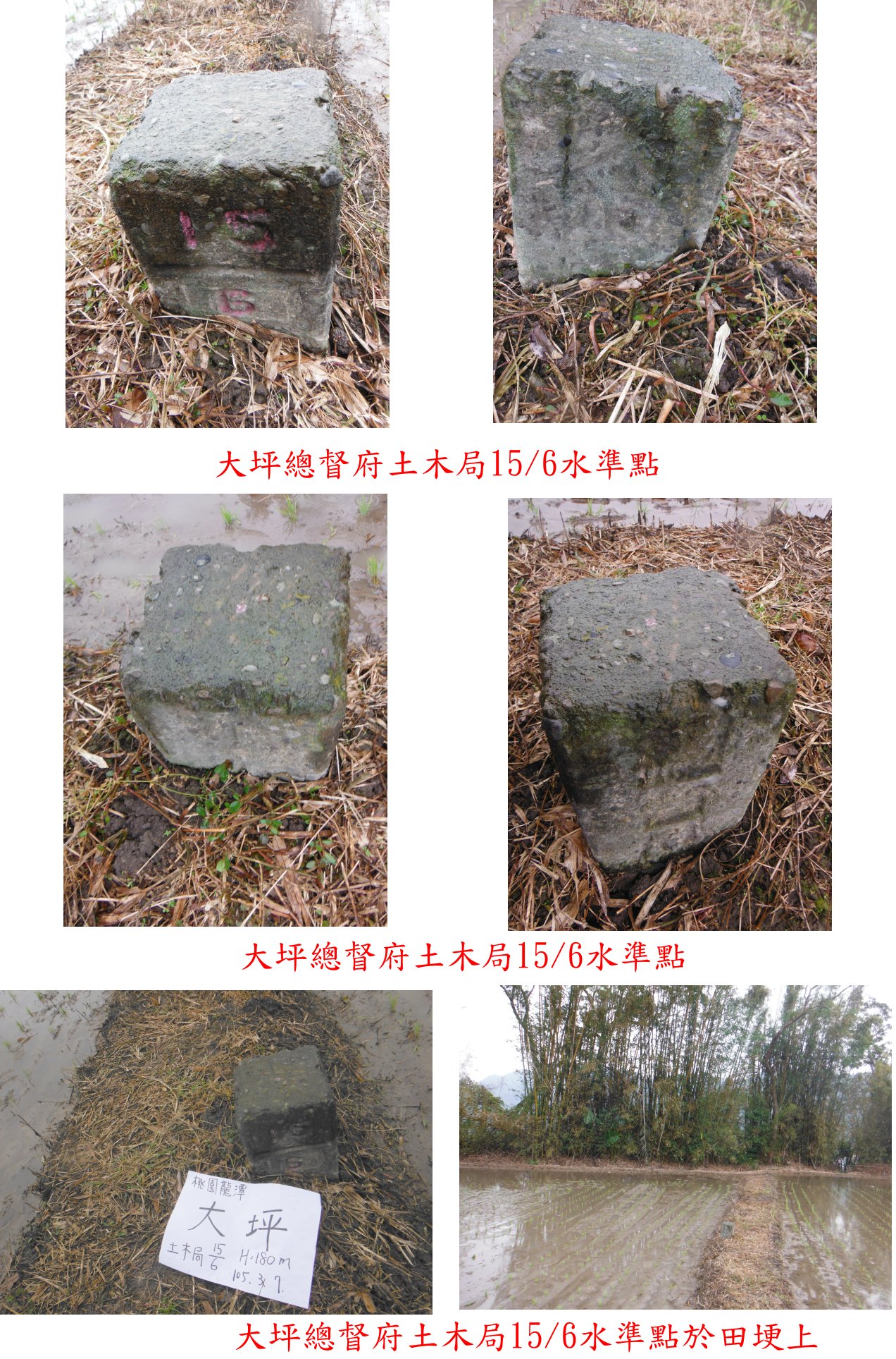 走田埂往東南方向走約170公尺即見到大坪土木局15/6水準點,於稻田的田埂上,距離竹林的防風竹林邊緣約5公尺。