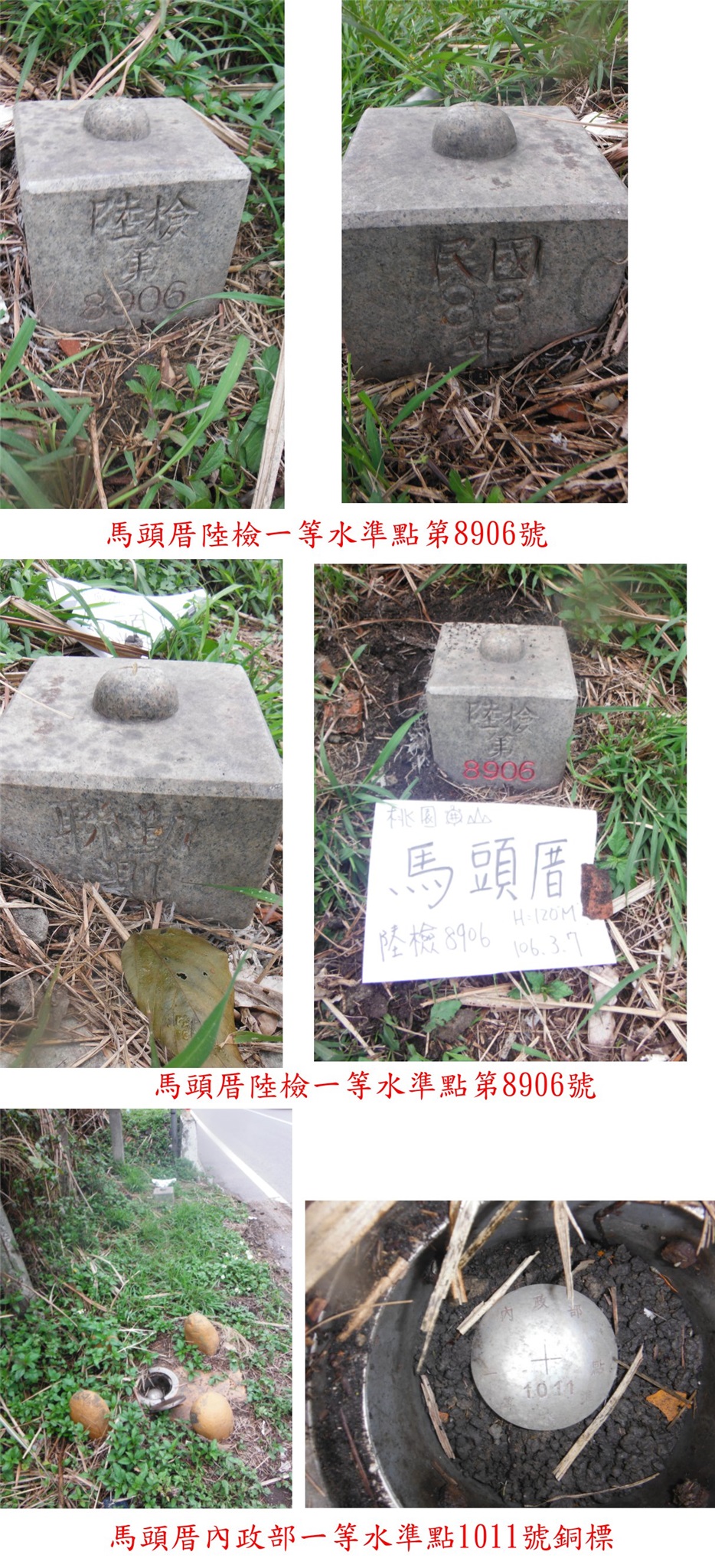 1、馬頭厝:位於桃園市龜山區,標高78公尺,陸檢一等水準點第8906號;座標286809 2766902。