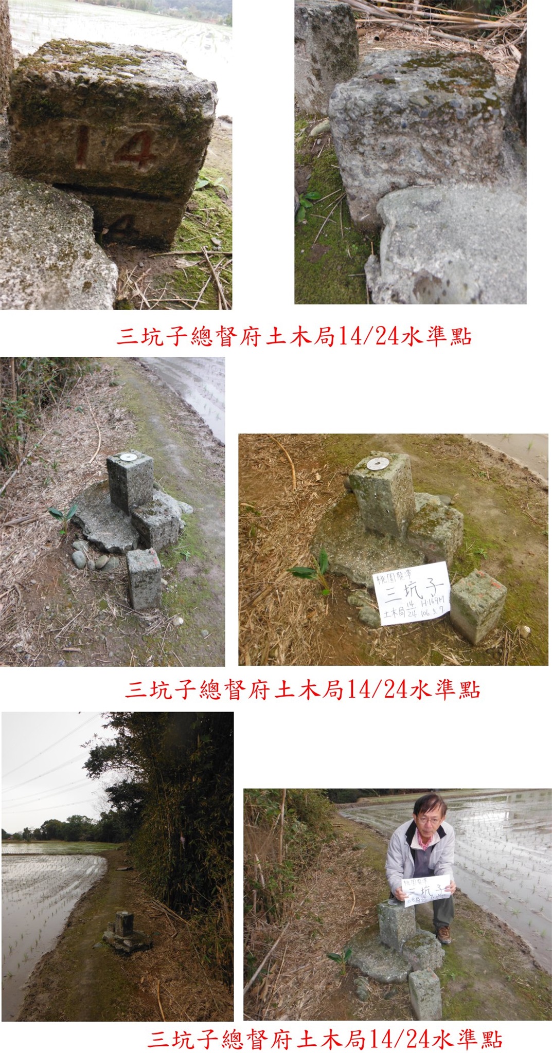 取右稻田旁的田埂走40公尺即可見到三坑子土木局14/24水準點,旁另有水利署淡左088號斷面樁與字跡不明的基石:三顆基石於稻田與竹林間的田埂上、明顯好找。