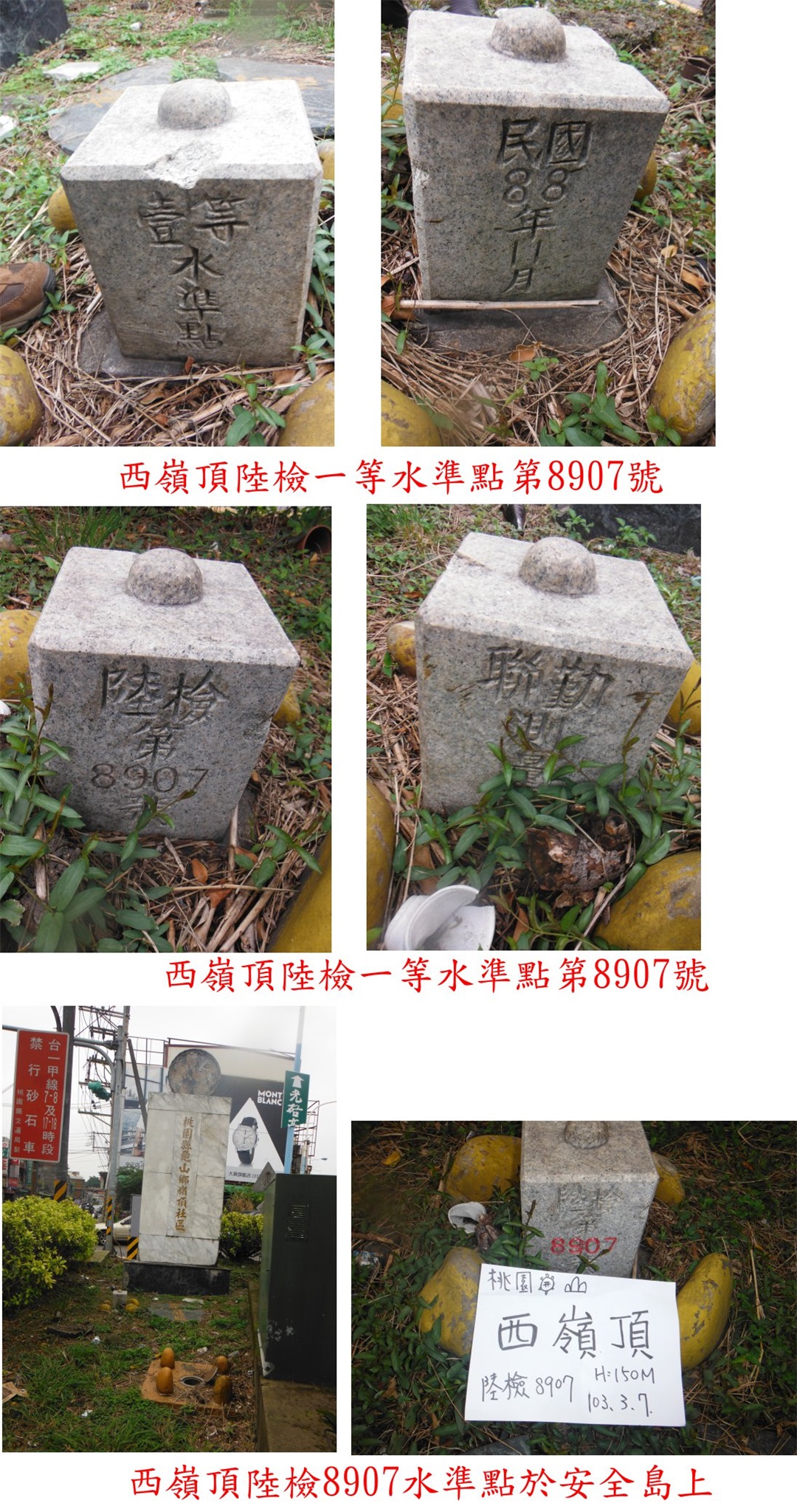 台1線與台1甲線的交會處有一安全島,西嶺頂陸檢8907水準點即於此安全島的草埔上,旁還有顆內政部一等水準點1012號銅標,邊緣水泥上另一桃園縣政府GLB2加密控制點;基石於桃園縣龜山區嶺頂社區的大理石碑下方、明顯好找,此二顆基石是小草隊朱兄提供資料的。