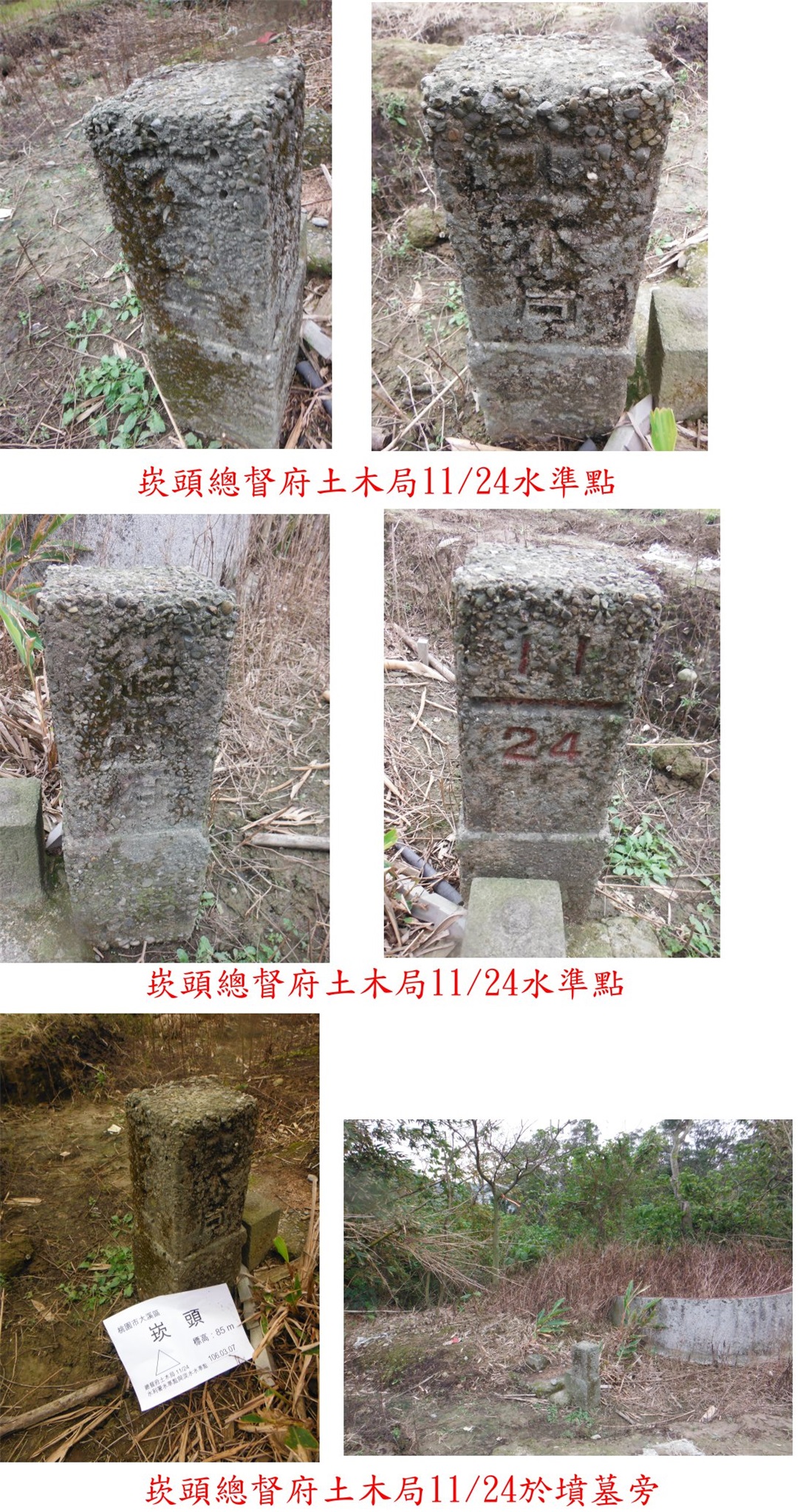 4、崁頭:位於桃園市大溪區,標高75公尺,總督府土木局11/24、水利署水準點與淡水等水準點;座標281014 2757801。
