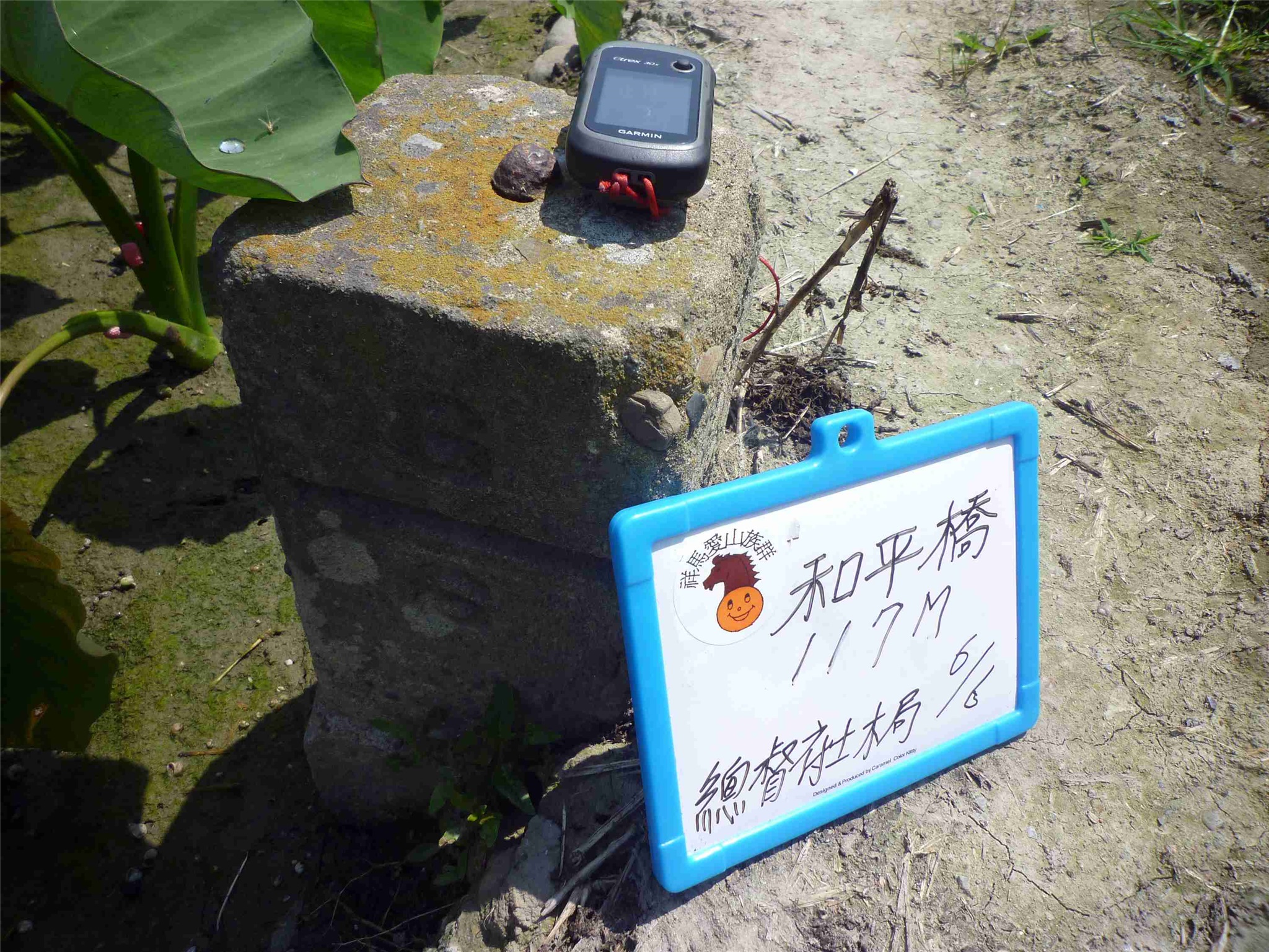 7和平橋(標高117M,日治大正五年總督府土木局6/6水準點),座標:230767.2709259,在黃色鐵皮屋對面,抽水馬達後水芋田埂上