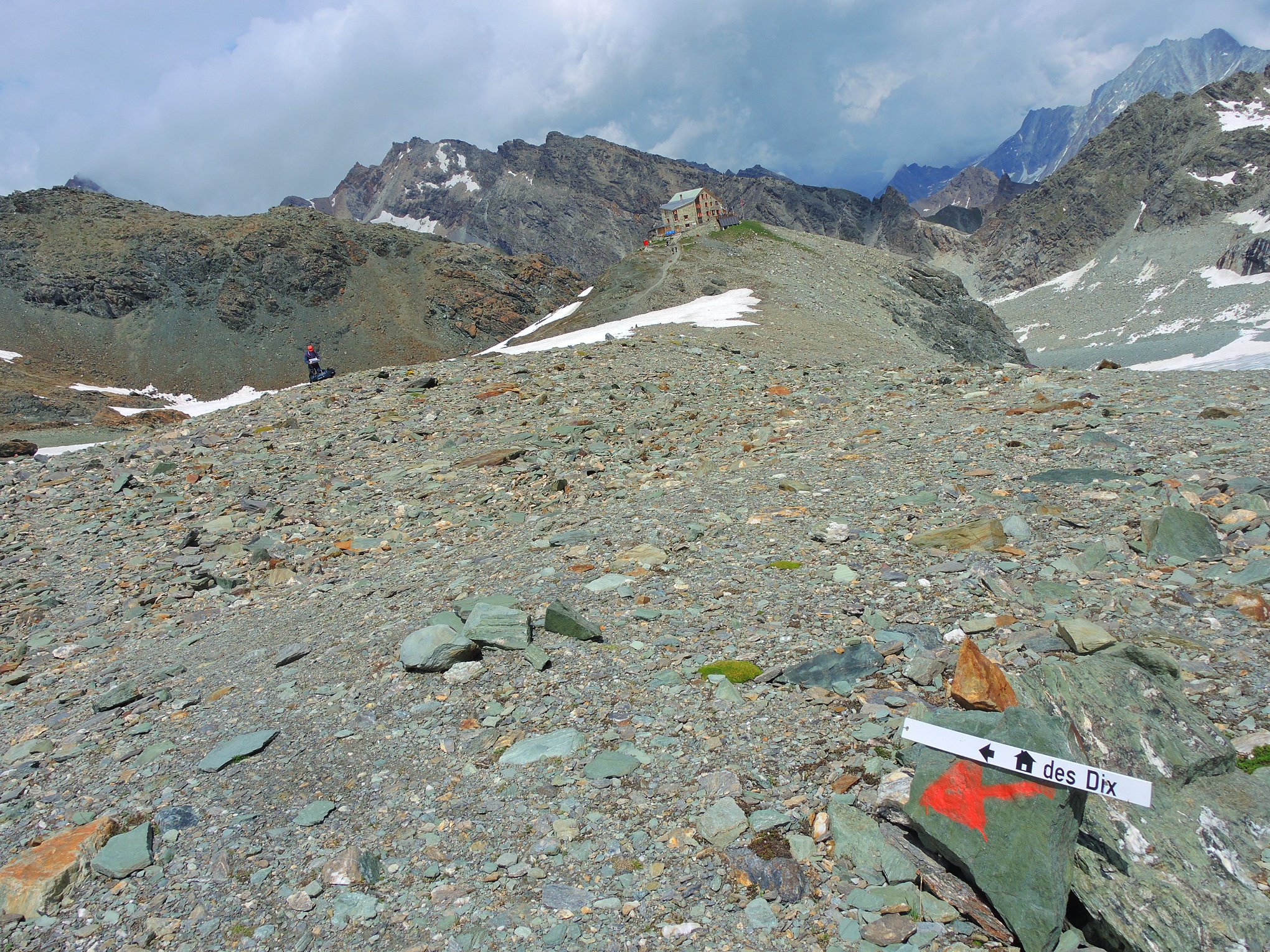 Cab. des Dix 2928m:屬於羅莎峰山群的山莊。CAS (Club Alpin Suisse)。在高處用望遠鏡搜尋時,我們看到位於蛇丘上被冰河包圍的山莊,景觀棒極了!東方壯麗龐大的Pigne d'Arolla是我們明日的目標,南方正對著Mont Blanc deCheilon的北壁,在接近山莊時,也正好看到有人由山莊旁的Tete Noire下山,下方冰河上也看到有人正往山莊接近。山屋前庭有人在喝啤酒聊天賞景,也有人走在繩索上練習平衡,相當熱鬧,大家都在享受辛苦過後午後的悠閒時光!與其他山友聊到次日行程,想要暸解Pigne d'Arolla的危險性?他建議我們直接問櫃台。櫃台前擺了幾顆蘋果,趕緊買了兩顆補充維他命C,這是6個山莊中唯一有賣水果的地方。工作人員除了要準備餐點外,還要解答客人各式各樣的問題。對次日要翻越的Pigne d'Arolla非常了解,給我們看資料夾上2張放大的山勢照片,用紅線標出避開冰河裂隙的路徑,並告訴我們明日有2個隊伍要上去請放心,只要跟著前人的足跡走即可,看著我們仍有疑惑的眼神,又開電視讓我們看空拍機拍攝的山頭,並詳細解釋路況,實在太感謝這些工作人員的不厭其煩!他們都是對這附近山區非常熟悉經驗豐富的嚮導級人物,值此夏季登山旺季在這打工賺錢。