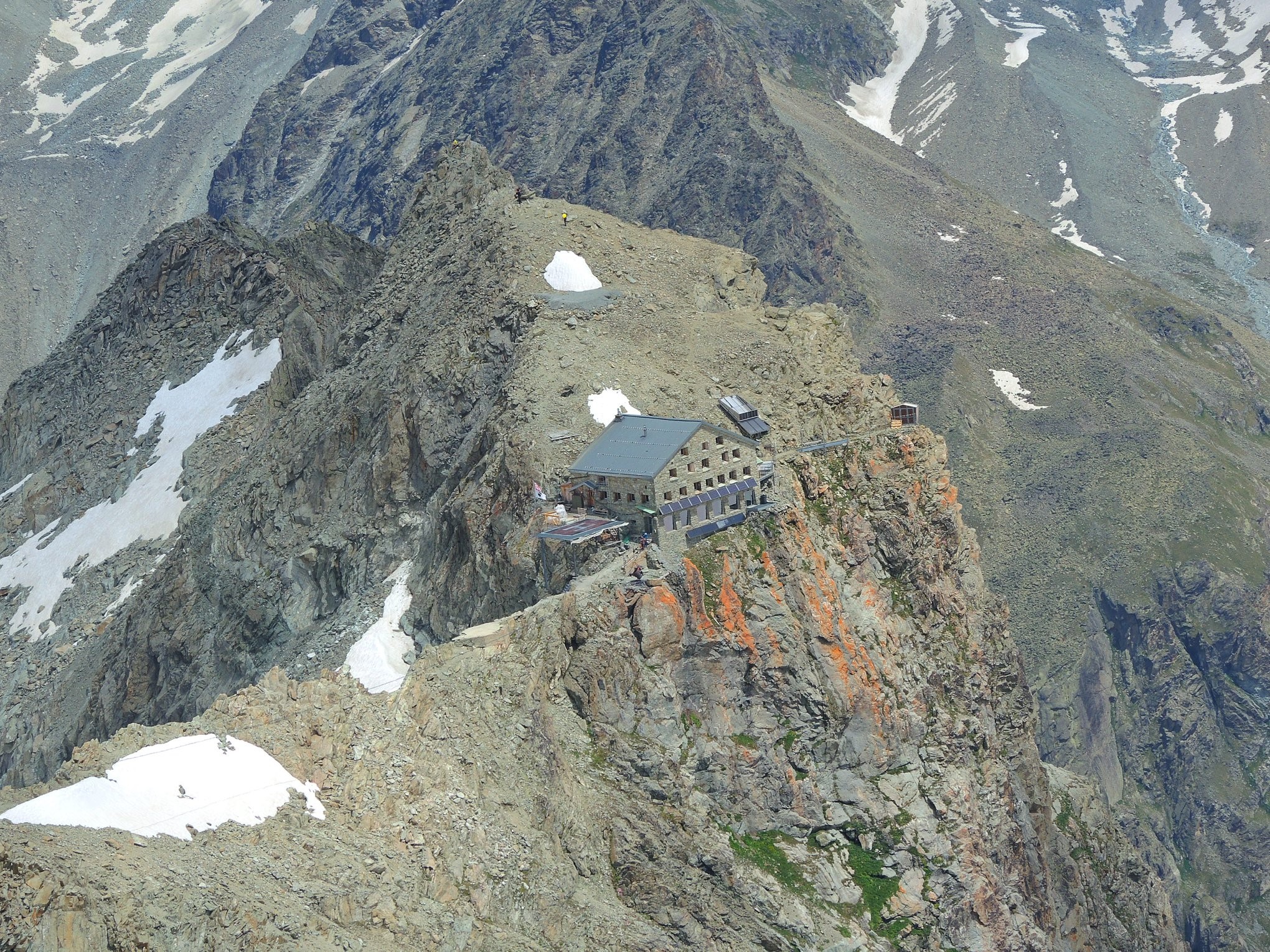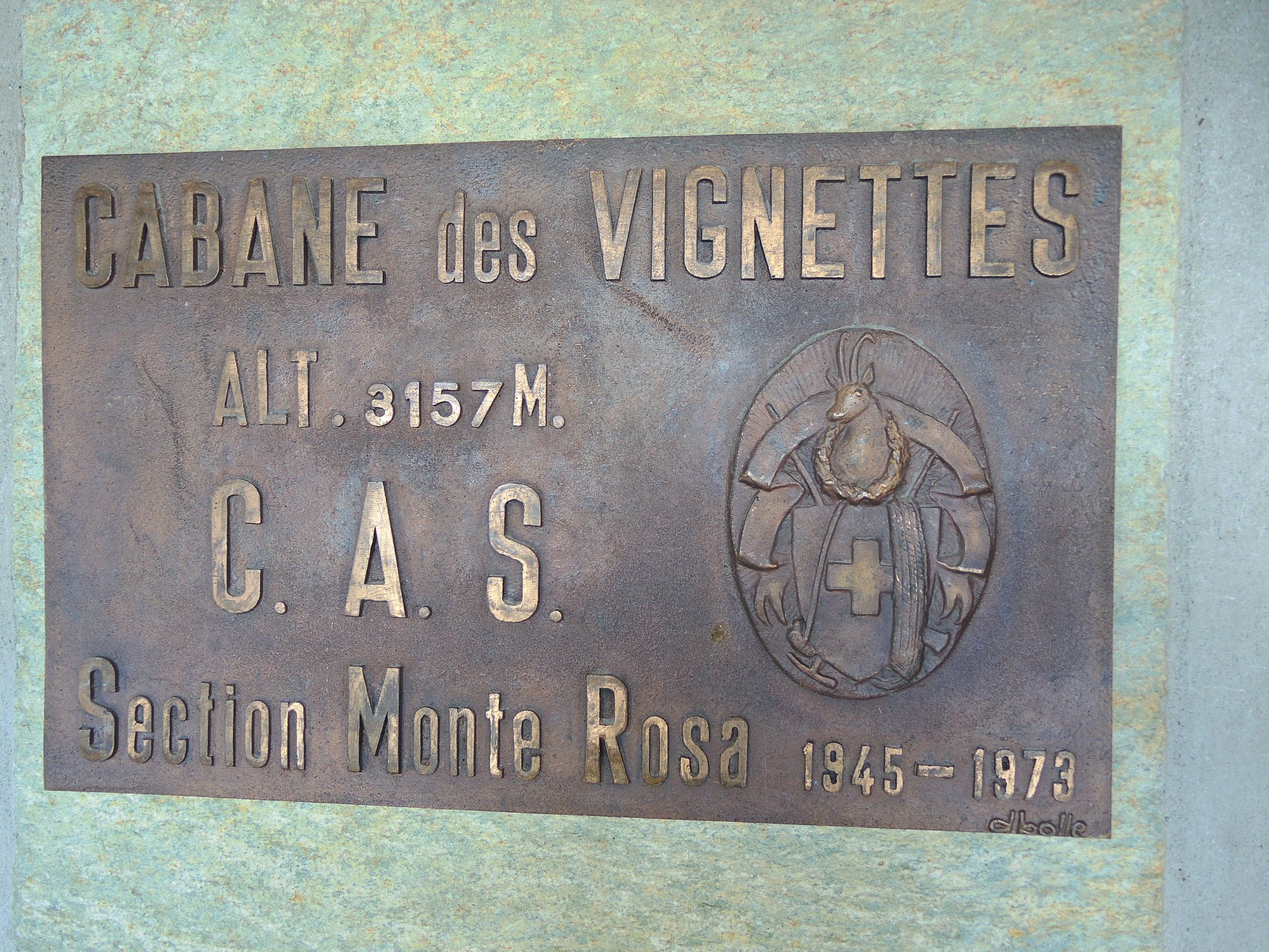 Cab.des Vignettes 3160m:也是屬於CAS羅莎峰山群的山莊。以為到山莊必須循稜攀岩過去,沒想到翻過鞍部,繼續橫渡Piece冰河,再上一段鐵梯就到了。也許雪多或雪少,路線會有差異。這山莊是水泥打造的3層樓建築,有別於其他山莊以木頭為建材。房間的配置有供人放置滑雪器材的地方,別小看這山莊今日小貓兩三隻,在滑雪旺季時可是一位難求!山莊走廊旁採用透明的強化玻璃落地窗,由此望出去前方是壯觀的Mont Collon 及Otemma冰河,下方是被冰河切割深不見底的谷地,令人屏息的美景!
