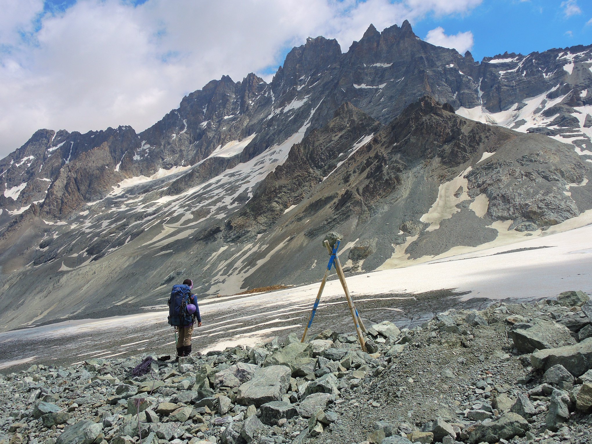Rocheux 3265m:這是Pigne d'Arolla東側的尾稜平緩岩壁區,冰河一路下降約600m來到此告一個段落,有個龐大的堆石。右下方是開闊筆直的Otemma冰河,山峰羅列兩側,形成一幅壯觀美麗的畫面!左前方則可見矗立在懸崖峭壁上的Vignettes山莊,令人讚嘆瑞士建山屋鬼斧神工之技術及膽識!