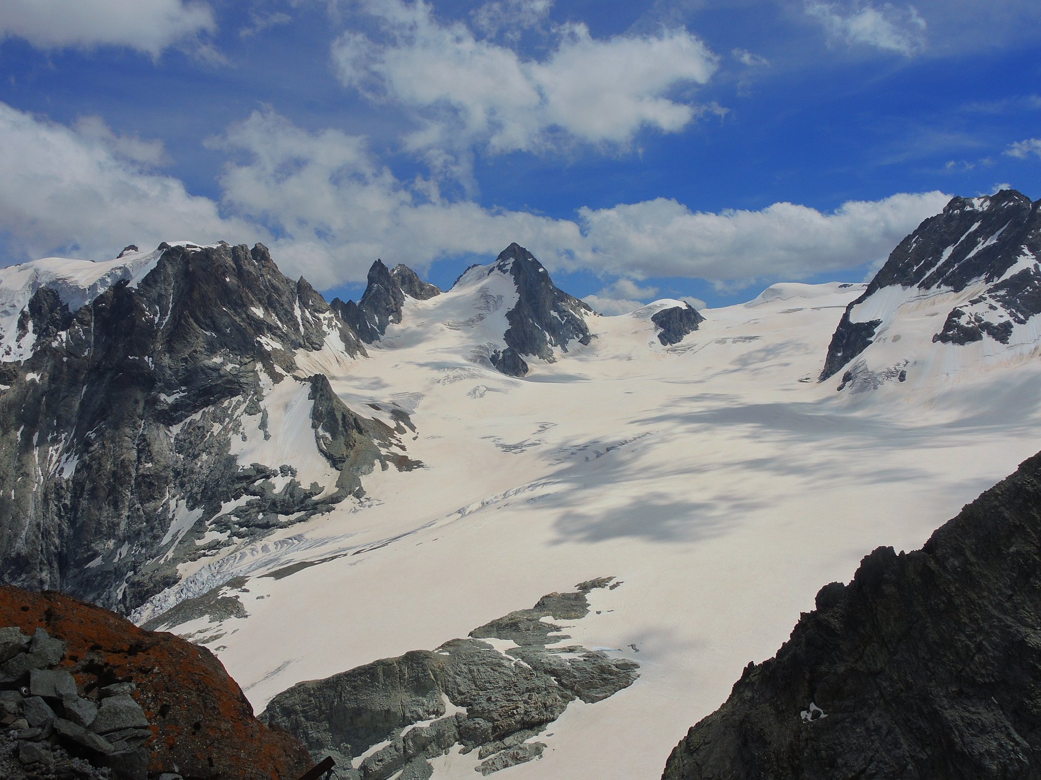 Col du Mont Rouge 3326m:這是今日最高的鞍部也是最陡的。我們看到上方4人小隊的四個黑點的行進路線,很幸運有先前部隊當參考點。先橫切大片崩石區,再橫渡雪坡再陡上冰斗。最後一段極為陡峭,是幾近垂直的雪簷地形。我先爬上平緩安全處,再幫淑梅把大背包背上去,她再用冰斧砍雪壁爬升,最後終於順利安全登頂!恰巧此時烏雲遮天,山雨欲來。山頂上強風陣陣讓人幾乎站不住,還好瞬間天氣又變好,此時我們已進入開闊平坦的Gietro冰河!我們找一塊石磧地休息午餐,今日又過了一個難關!