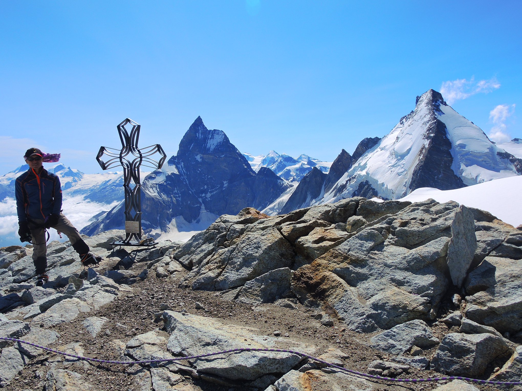 心情好景色佳,不知不覺來到山頂,這剛好有一片裸露的地,還有一個藝術造型的十字架,記得馬特洪峰山頂上也有一個。Tete Blanche剛好面對Matterhorn與Dent d'Herens,兩座都是義、瑞界山,也相當雄偉壯觀,尤其後者四角柱形的山型,更令人一見難忘!這是此次冰河健行最美的時刻,再多的辛苦都值得,心中激動莫名,感謝老天爺賞大景!我們邊往下走邊欣賞馬特洪峰北壁優美的山形,這角度可以看到由義大利攀爬馬特洪峰的路線---Furggen ridge,體驗橫看成嶺側成峰的感覺!
