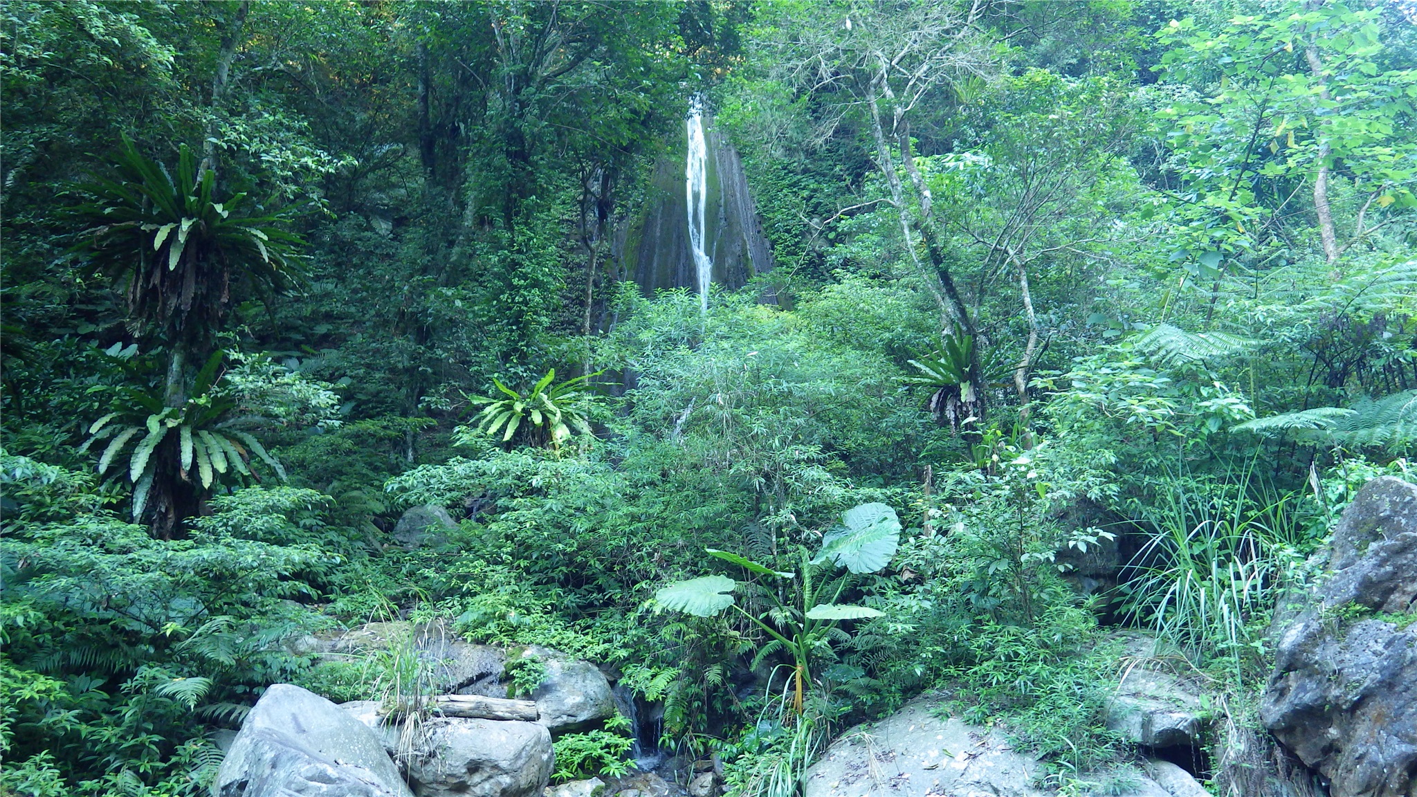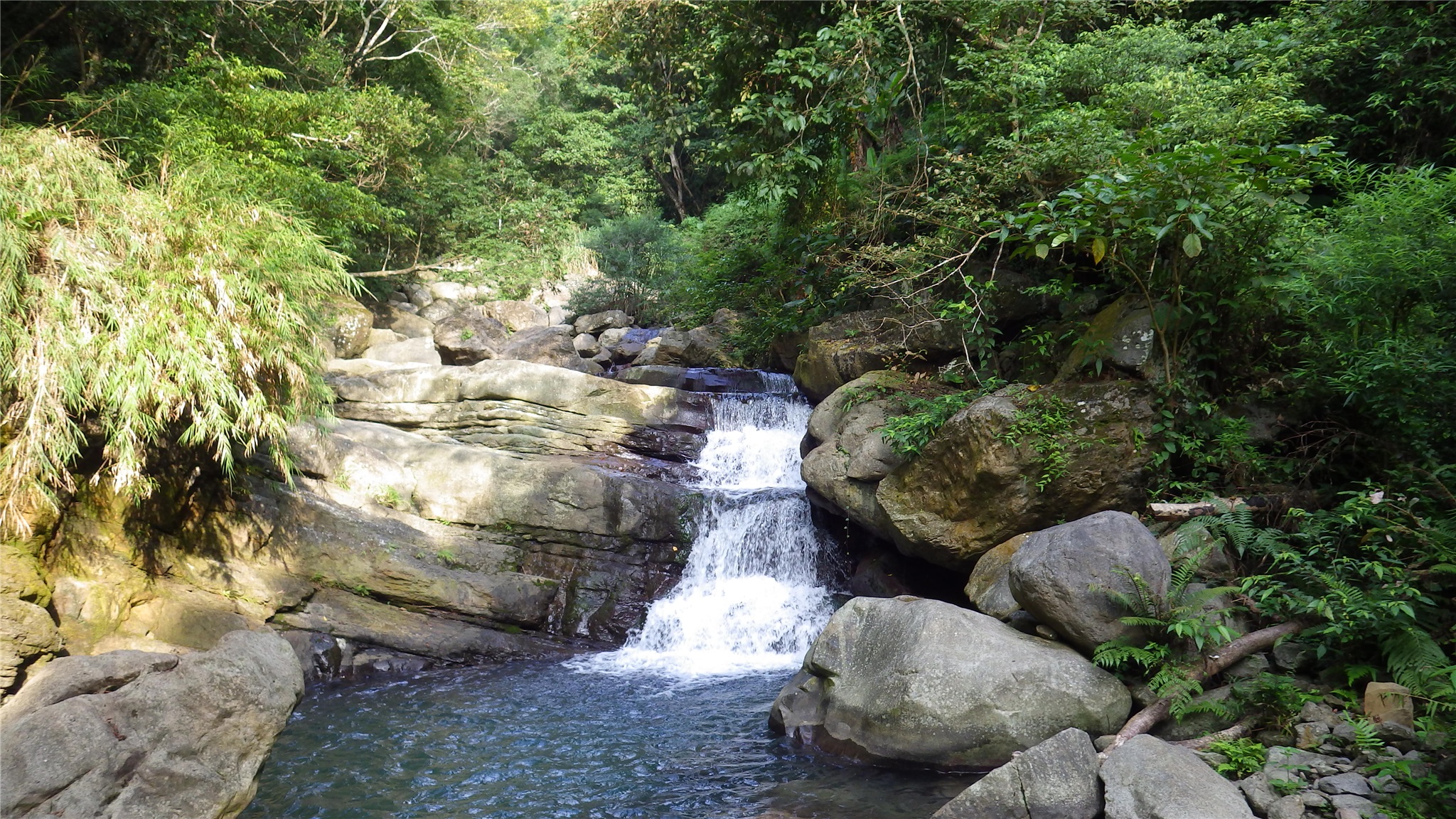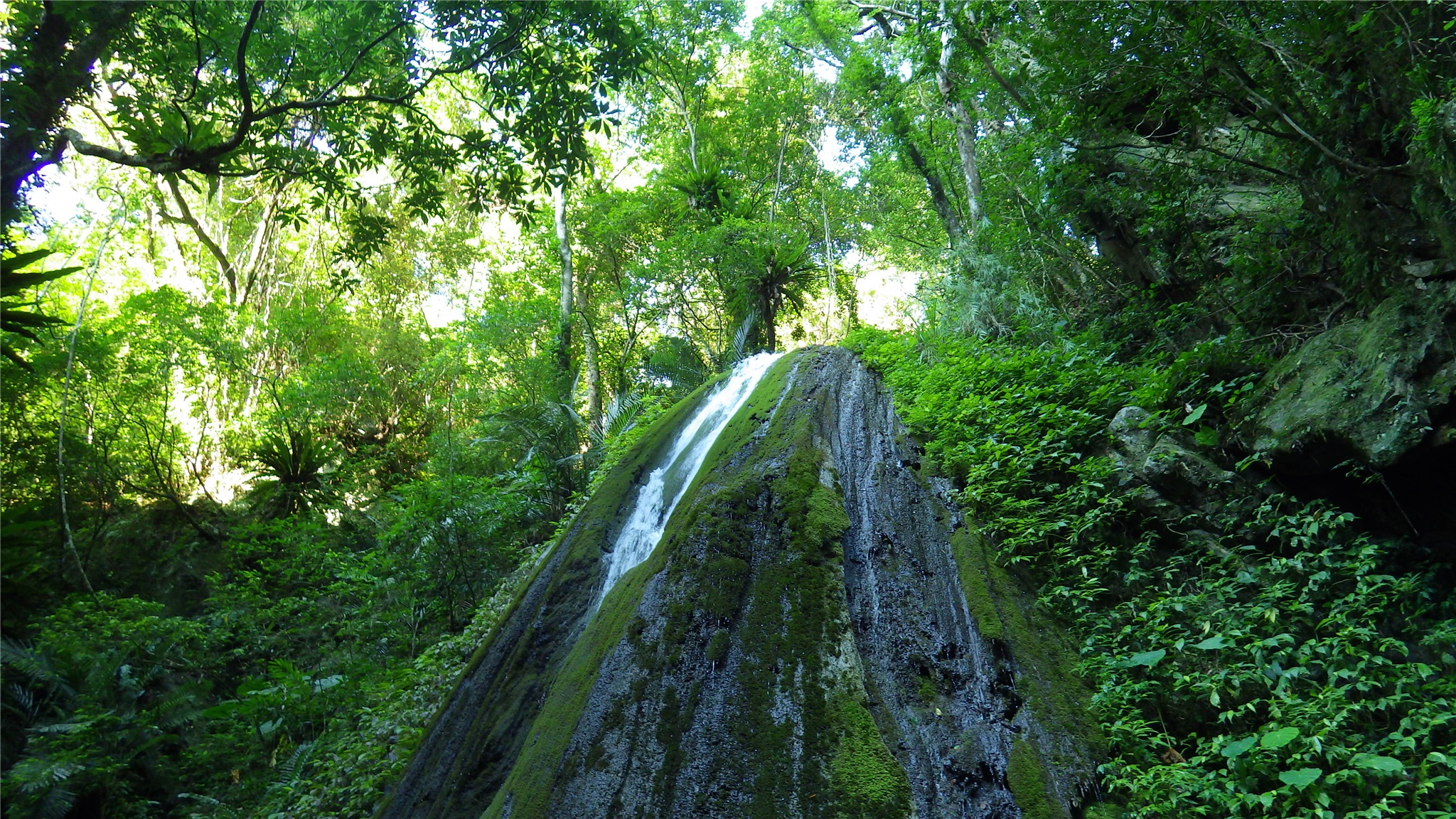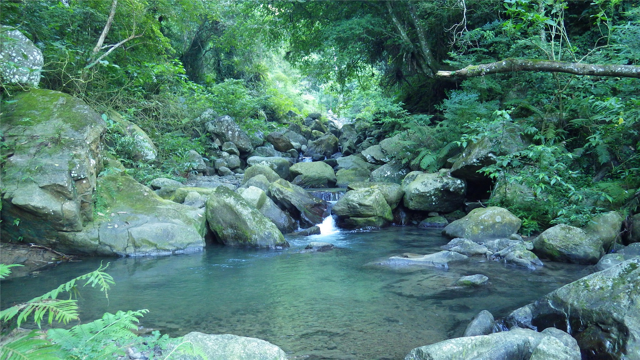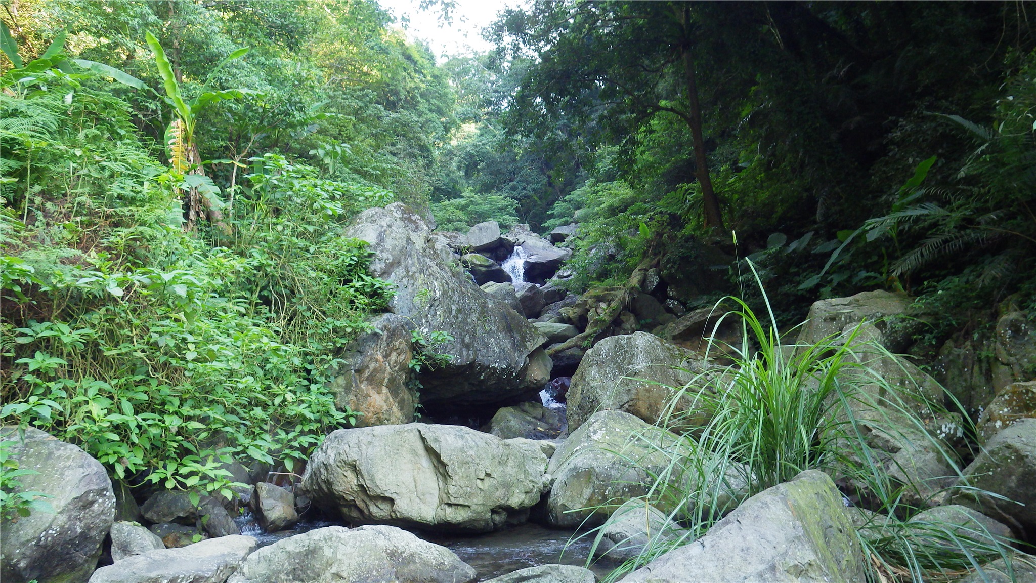 順著溪谷上登,時而沿水管路,時而沿溪跳石而上,一路濕滑,並不是很好走,有時遇到有刺植物,有時遇到溪石落差太大,仍需時時觀察地形地勢如何攀爬而上,溪谷沁涼,一路拍照取景而上。