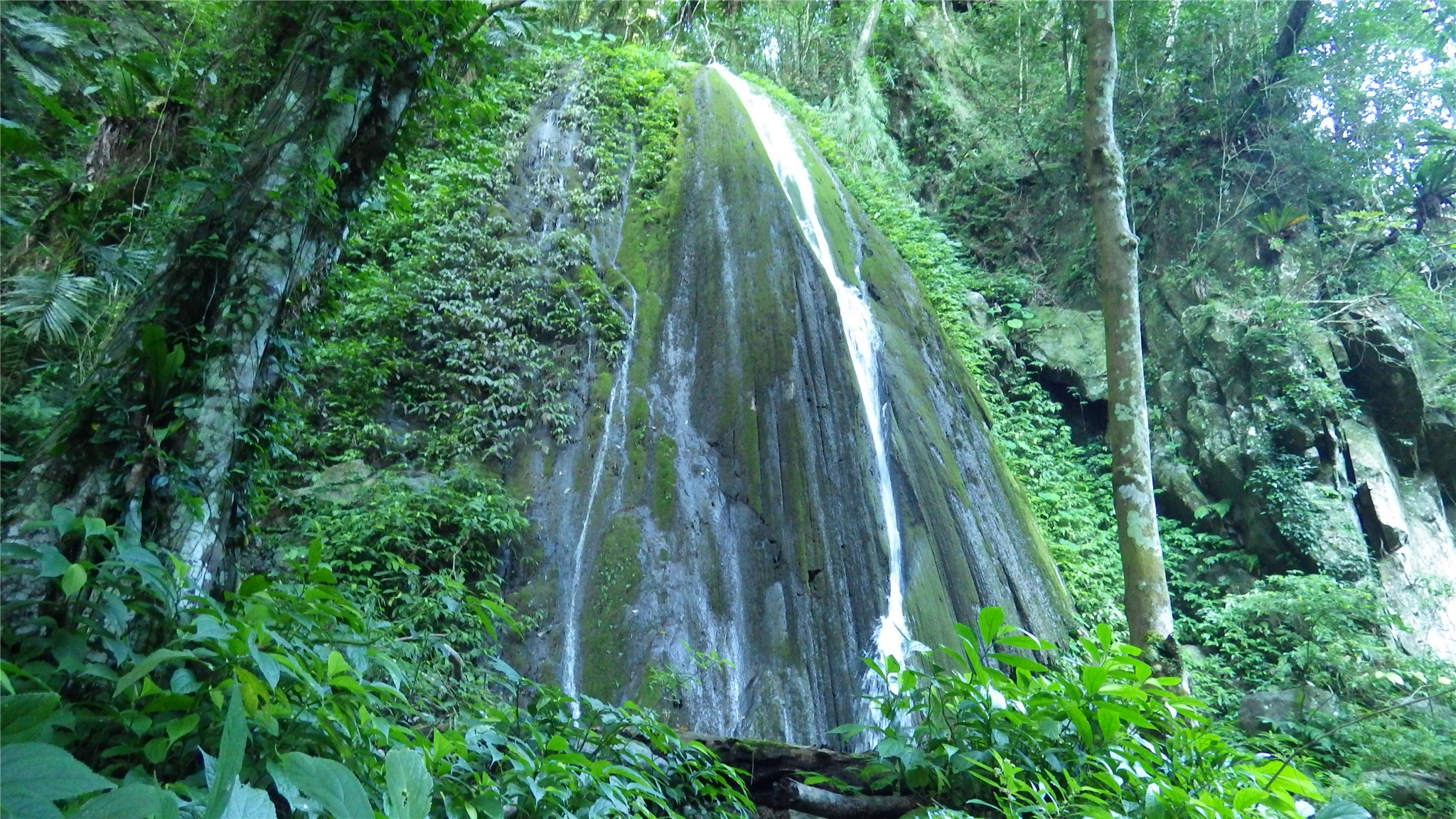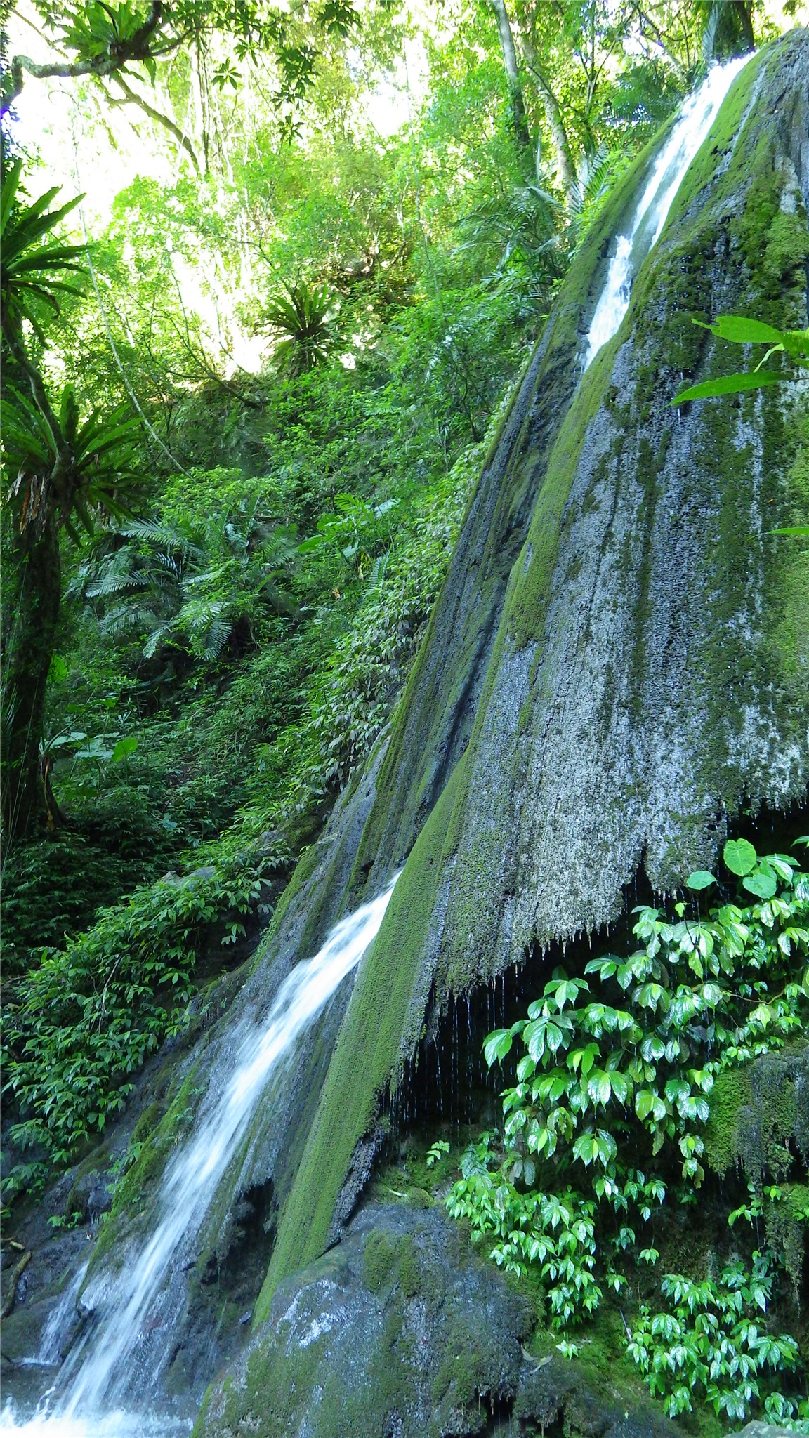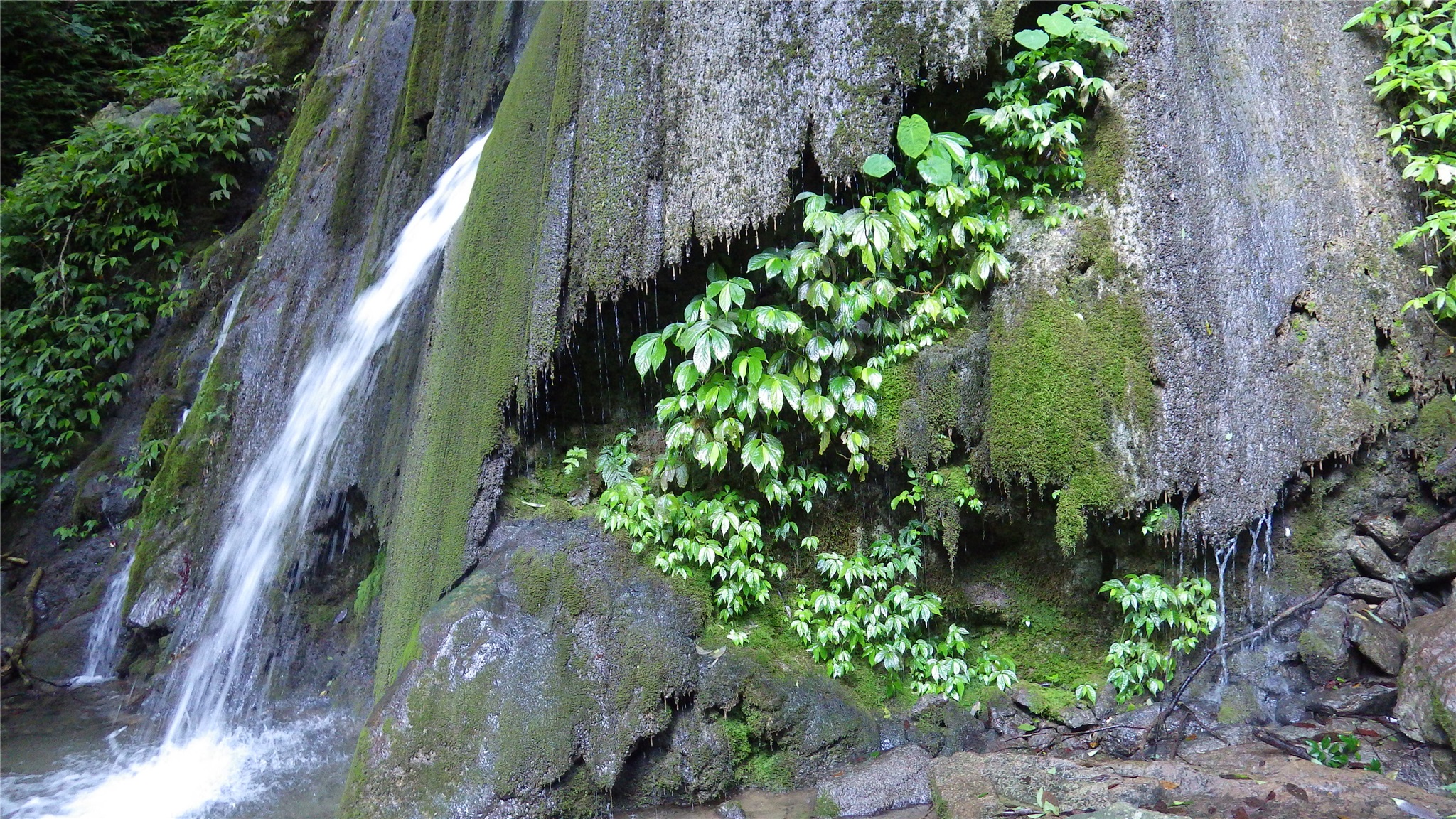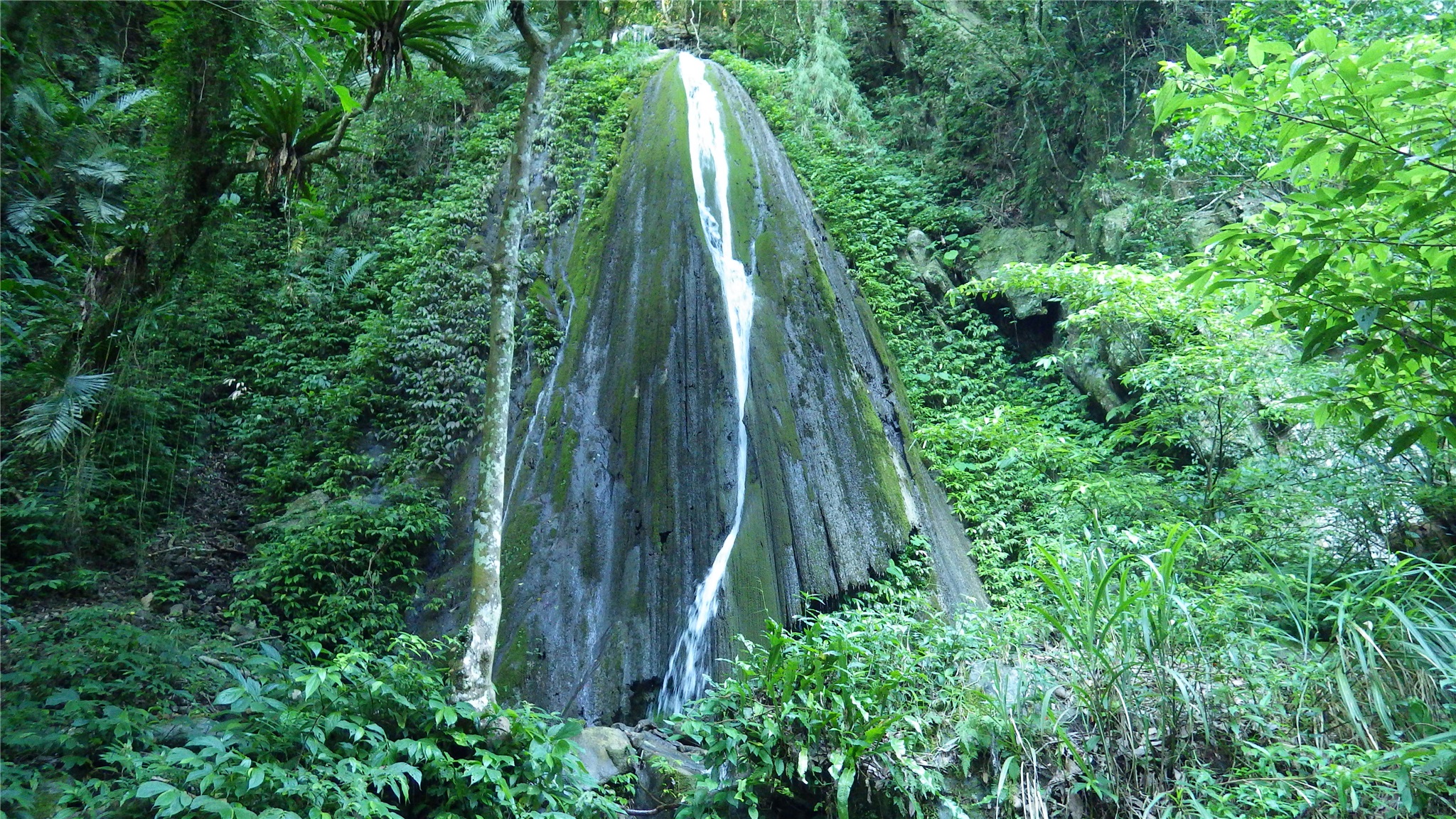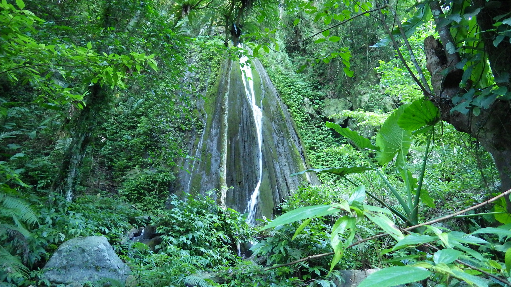 最後就看到銀絲瀑布坐落在溪床左手邊的山壁上,遠遠看來已有幾分美感,走到瀑布下方,這一縷涓流從石上中間而下,經過歲月的洗禮之下,已在石上刻劃出一道溝渠出來,但似石的後方又可見掏空模樣,真是難保未來還有此瀑布美景~ ~ ~
