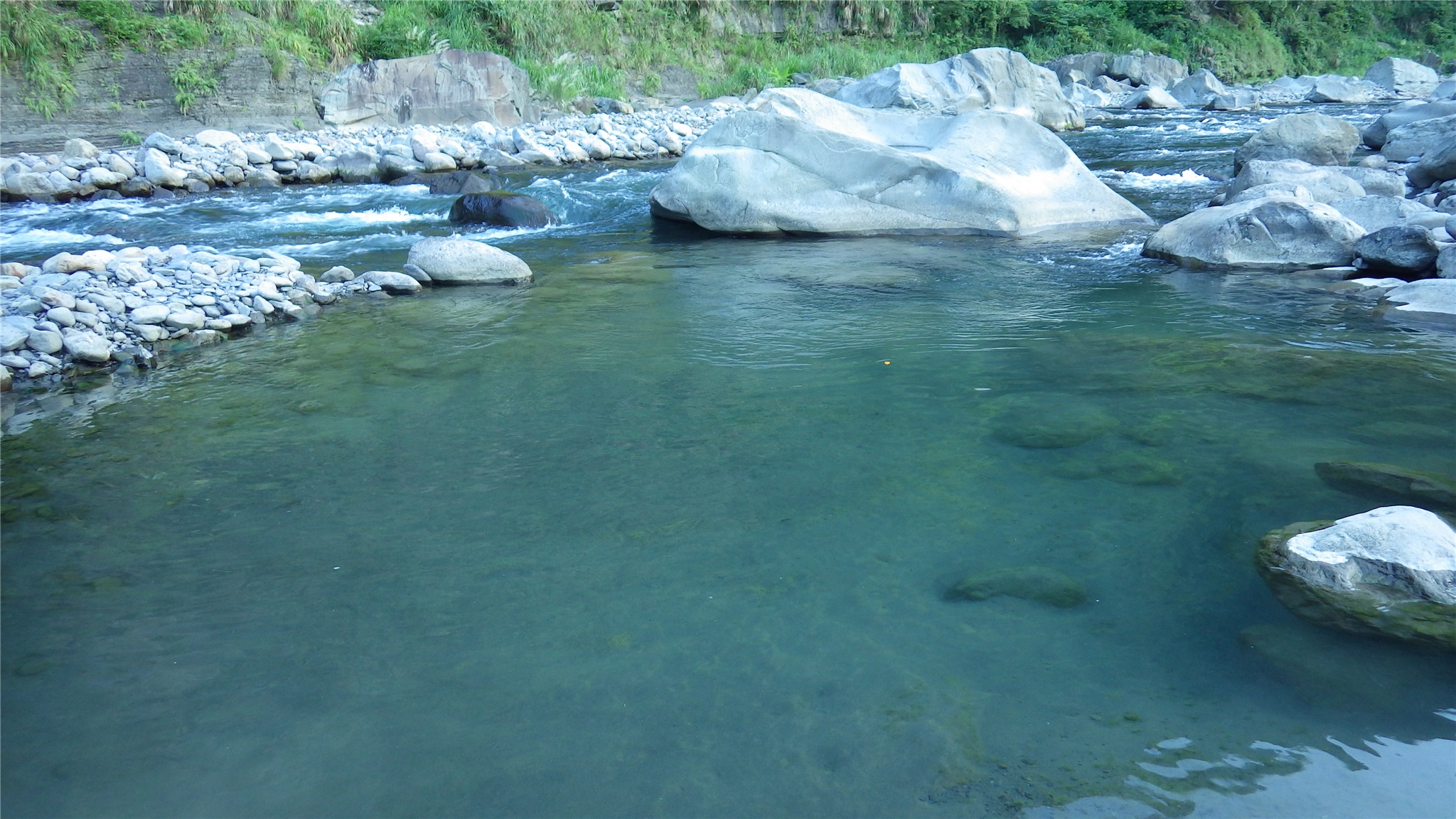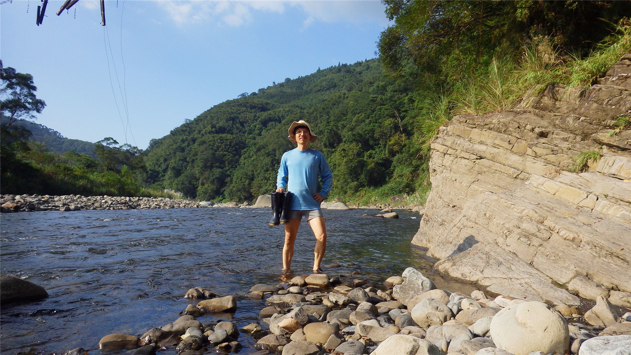 駐留片刻充分取景後復返,回到越溪點懶得脫下雨鞋,直接穿越溪水而過,如先前所料,溪水淹至大腿處灌入雨鞋中,不過這不打緊,回程溪邊有座天然緩流潭水,非常適合洗滌浸泡,享受一番清涼,全身恢復舒爽暢快,真是不虛此行,讚啦!
