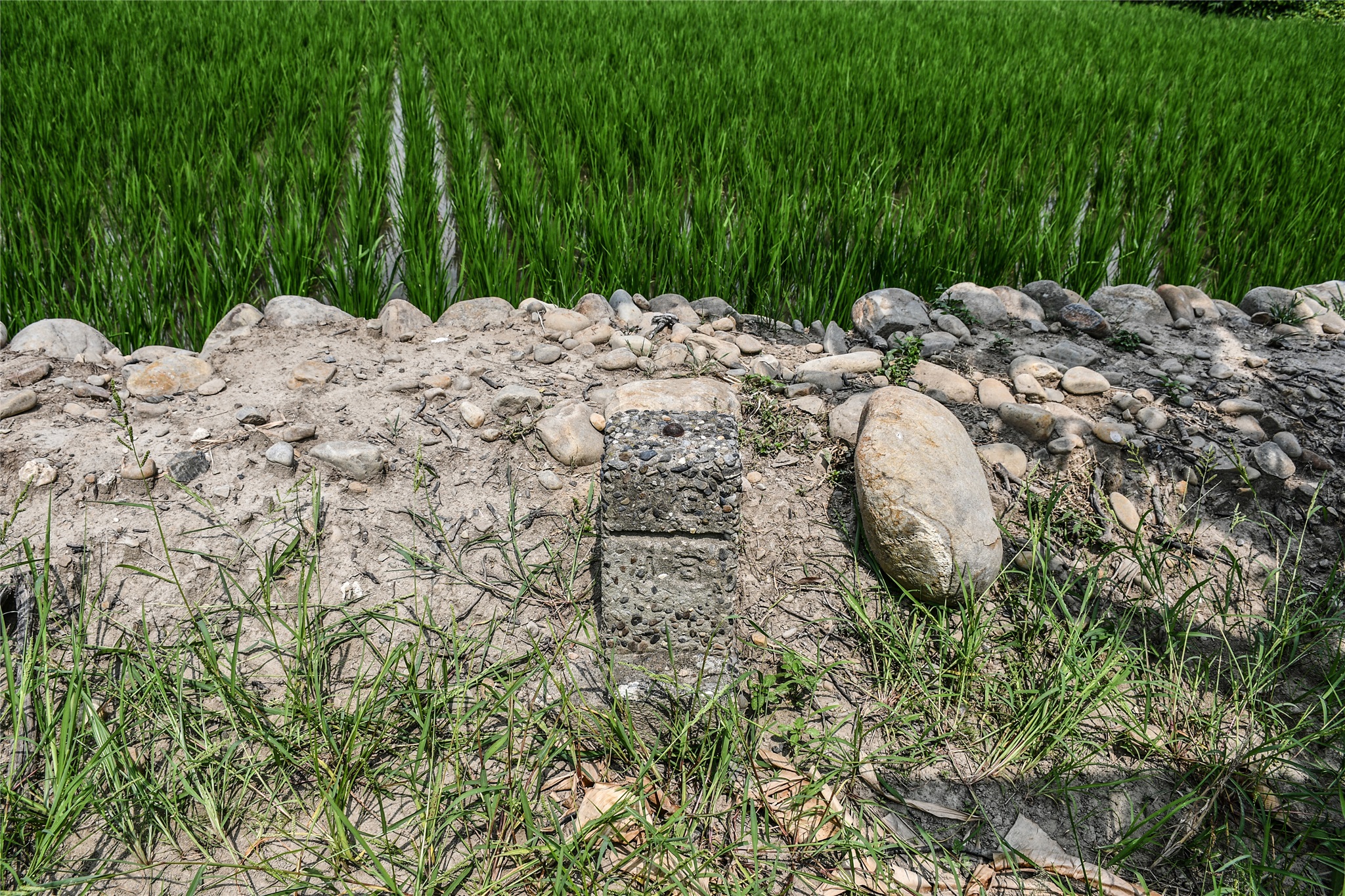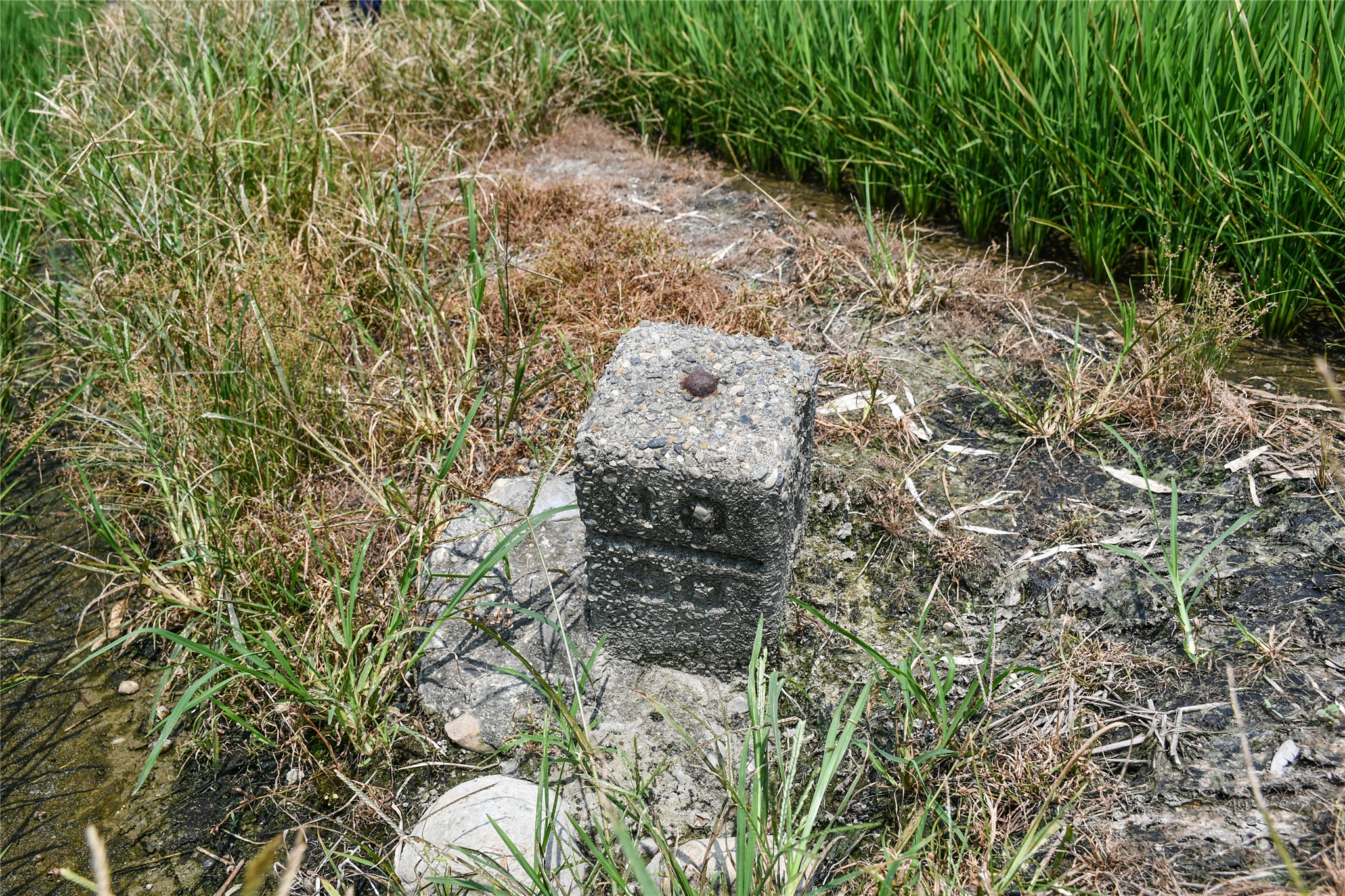 由廢雞舍西北約15公尺處左切入田埂朝西南走約18公尺,即可見到田埂上下崁底南的大正四年總督府土木局烏溪左岸10/30河川町杭。