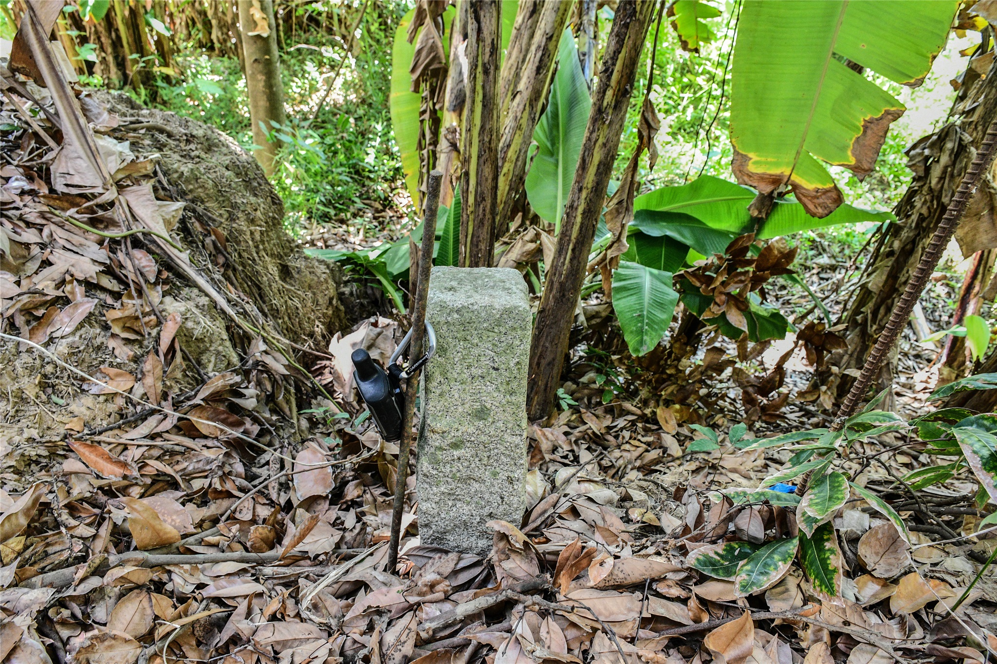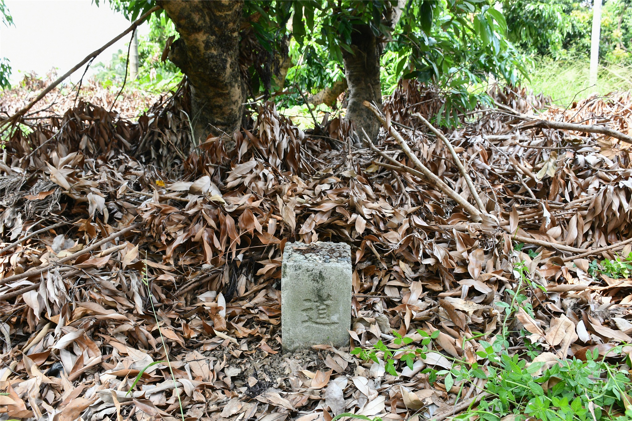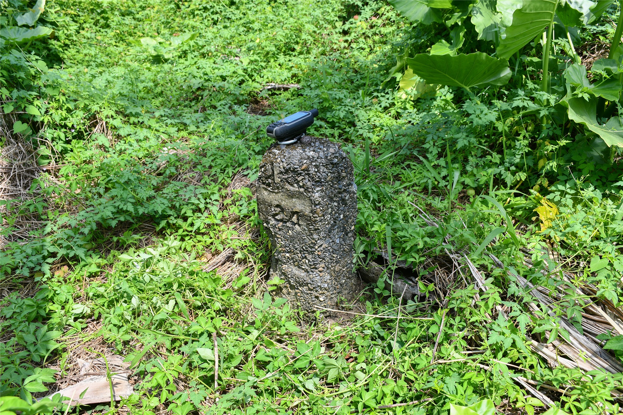 由土城圖根點回到停車處在停車處東邊約42公尺水泥路北側5公尺的一棵龍眼樹下找到一根側刻”道”字的不明石柱,大小和一般圖根點相差無幾,座標223586 2653586。