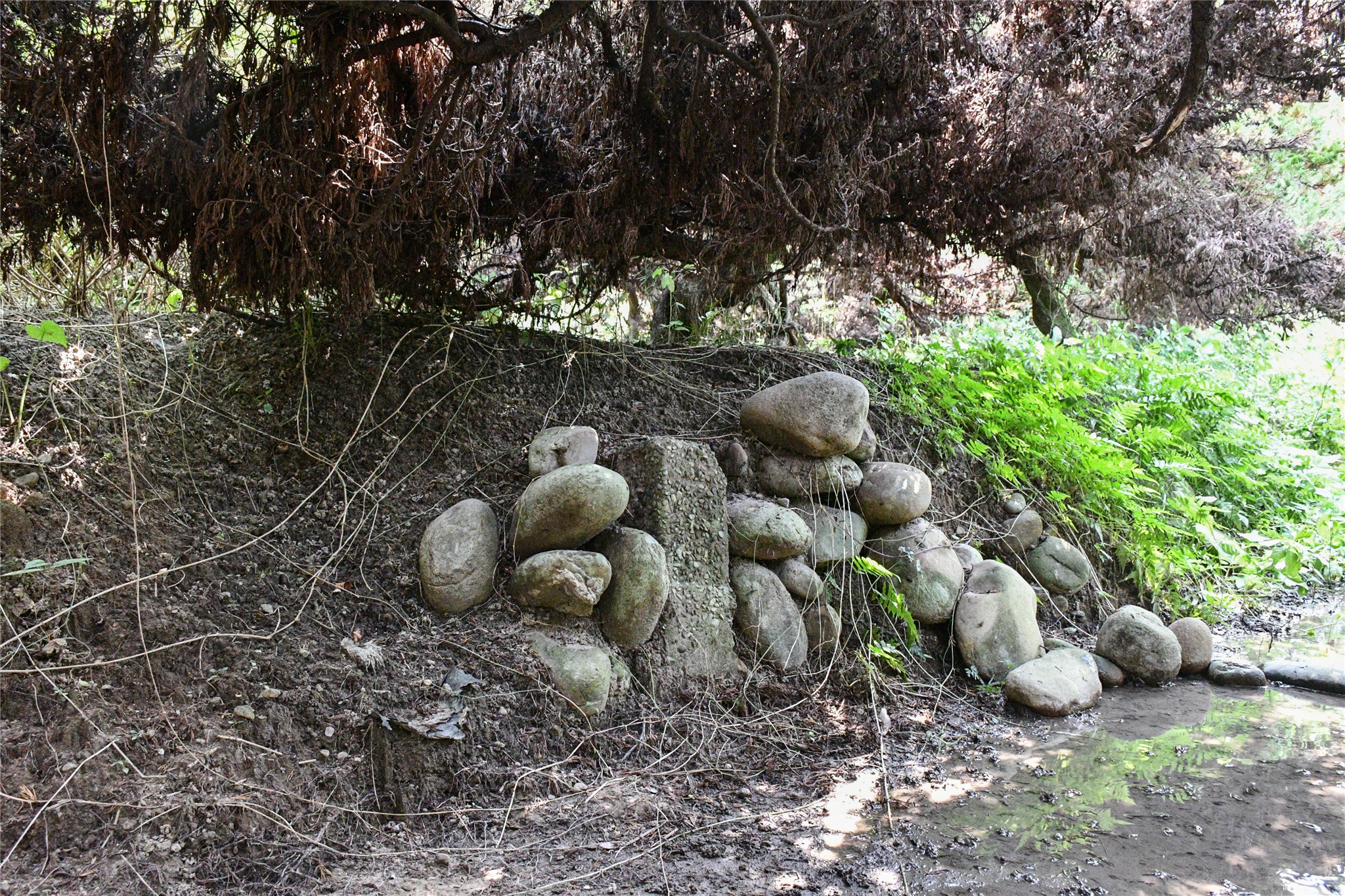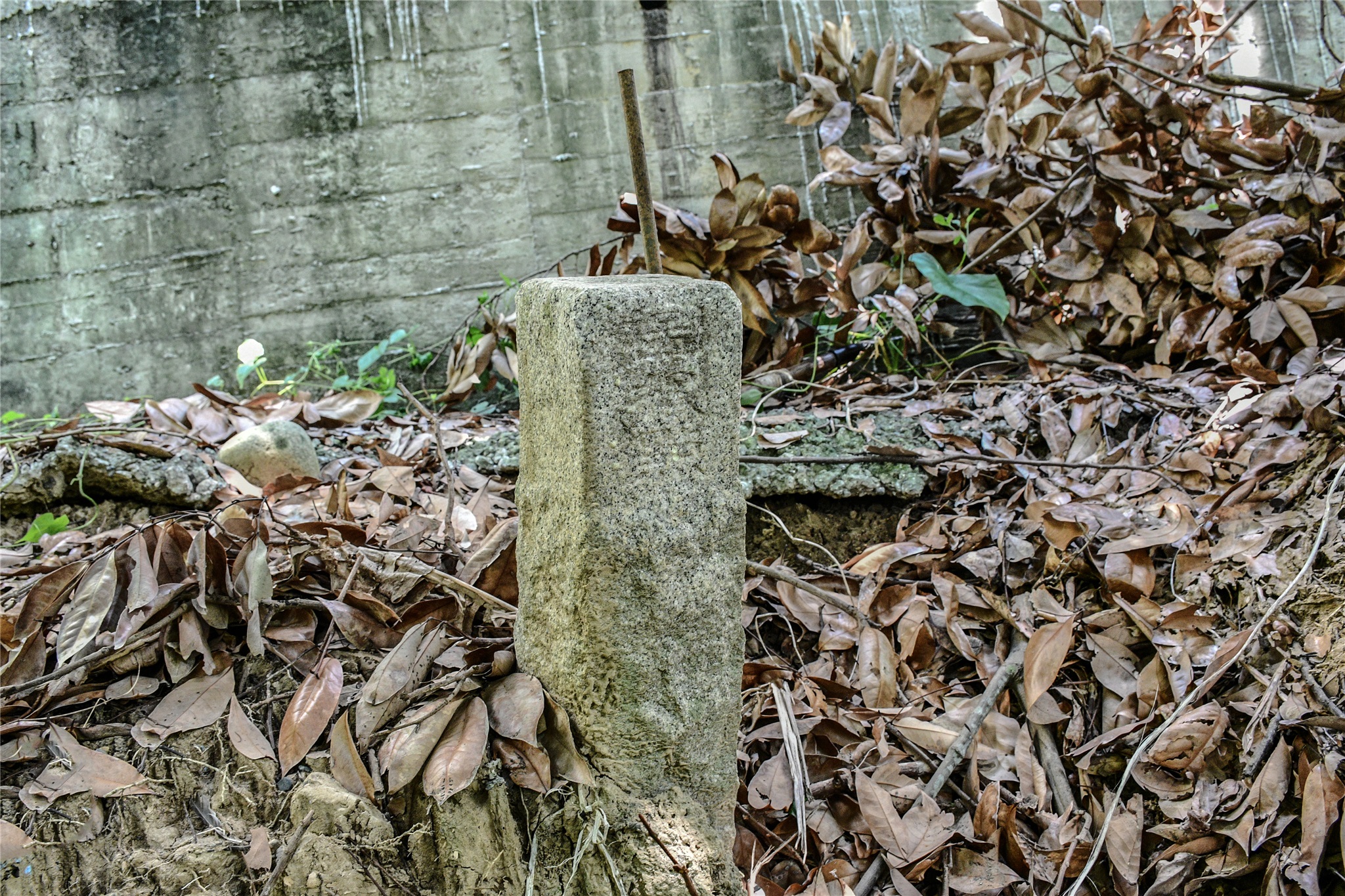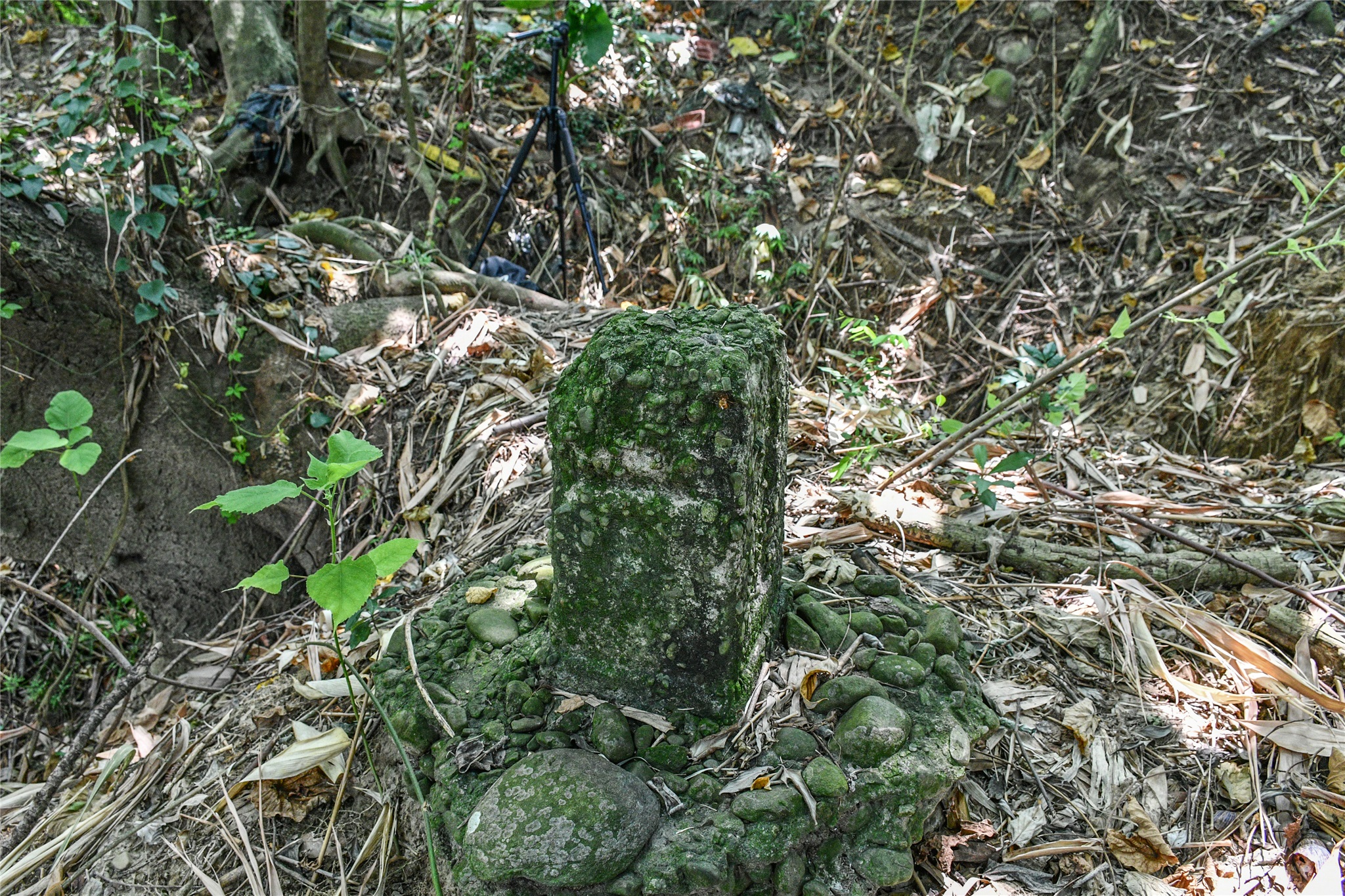 由土城圖根點回到停車處在停車處東邊約42公尺水泥路北側5公尺的一棵龍眼樹下找到一根側刻”道”字的不明石柱,大小和一般圖根點相差無幾,座標223586 2653586。
