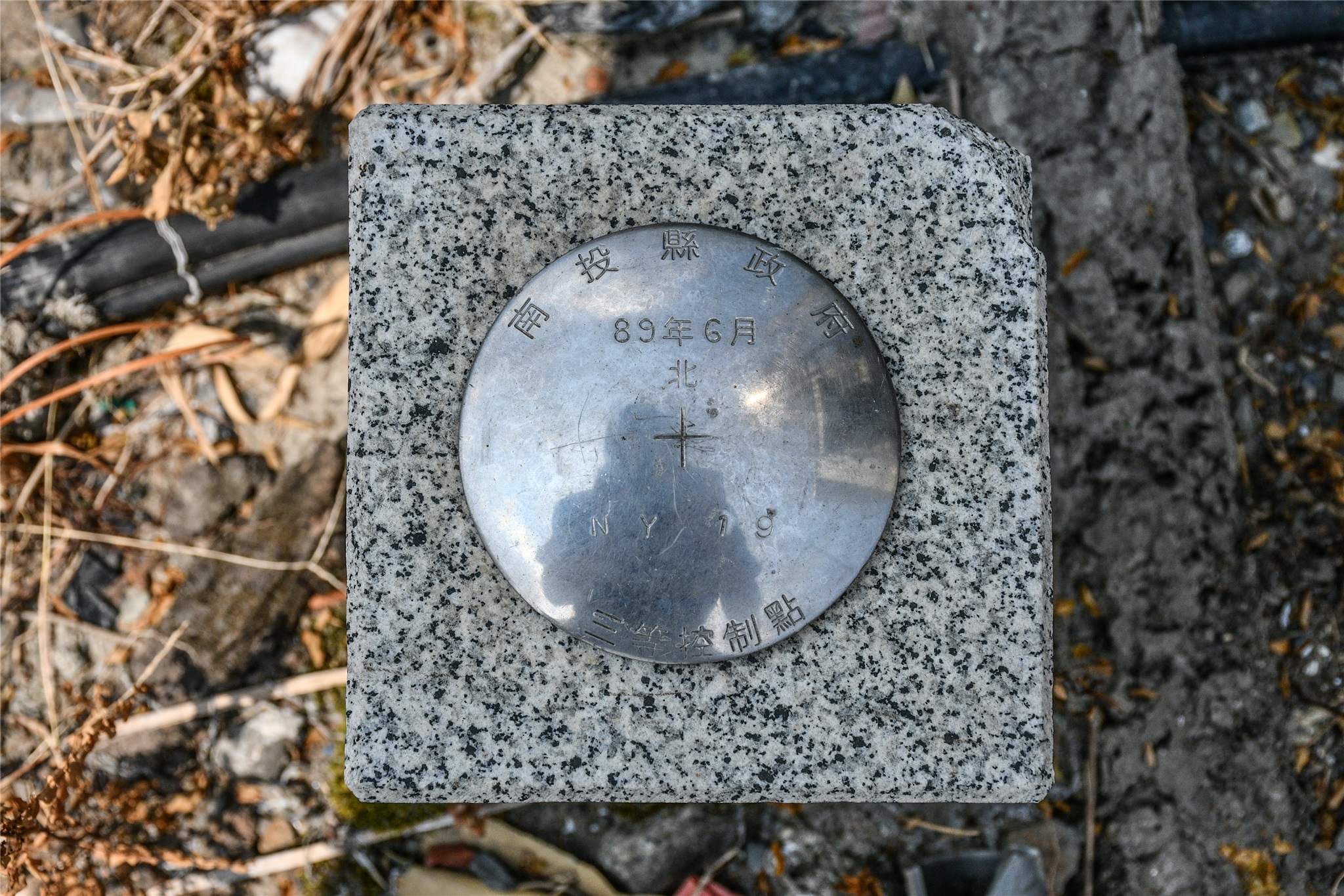 由停車處開車回到岔路口在猴子雕像下找到一枚南投縣政府於民國89年6月所立的”NY19”號三等控制點鋼標,座標223401 2653572。