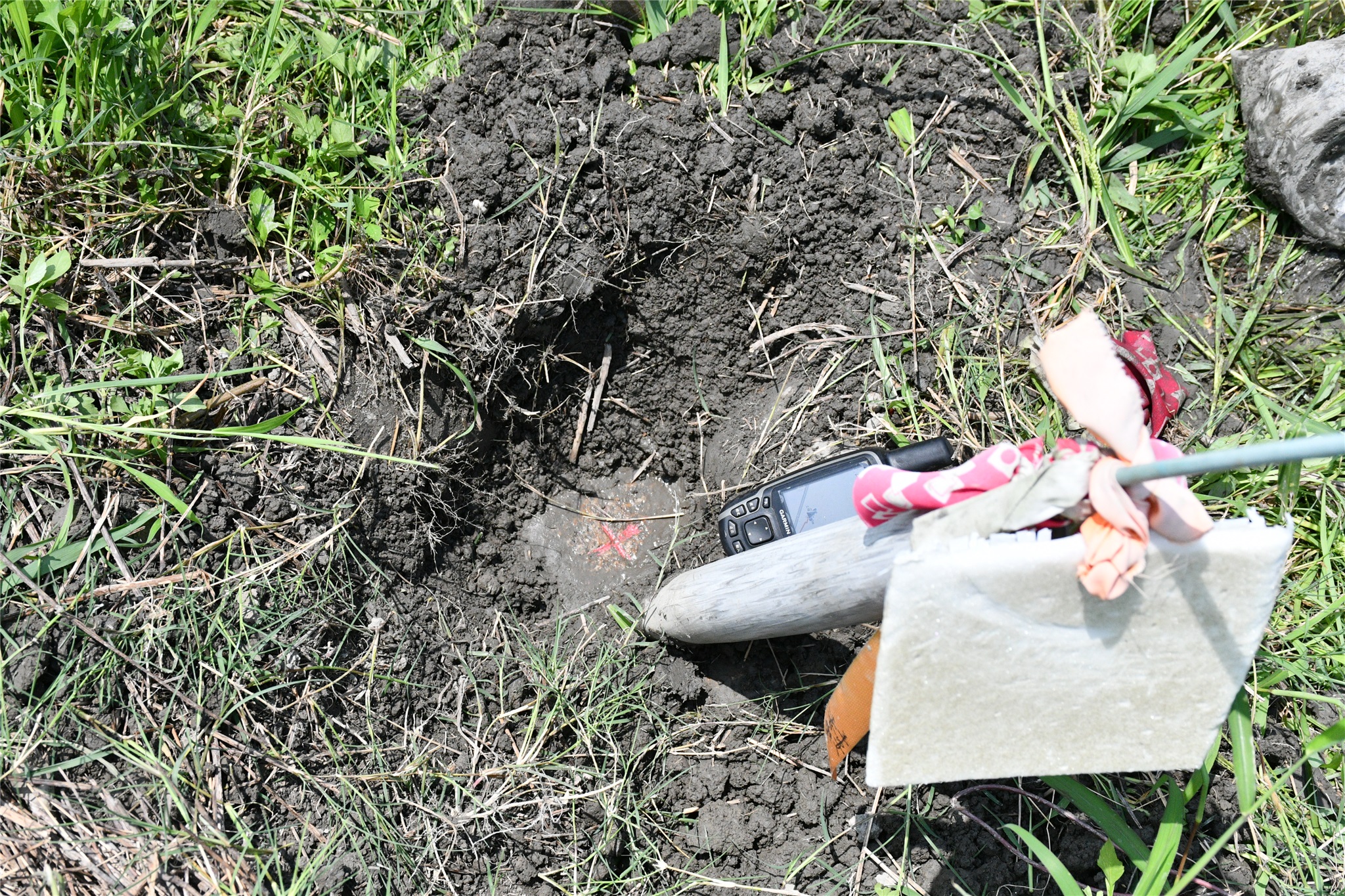 路右一田埂距農路10公尺處插有一根水管上綁路條即為土城冠字武(29)的土地調查局圖根點點位,圖根點埋土約30公分,上壓數塊石頭,搬開石頭再下挖10公分左右即看到基石上端的”十”字,如想看到側面刻字尚需費時開挖,座標223451 2653779;此點係大鵬醫師來了數次方找到,現已挖出應很好找了。