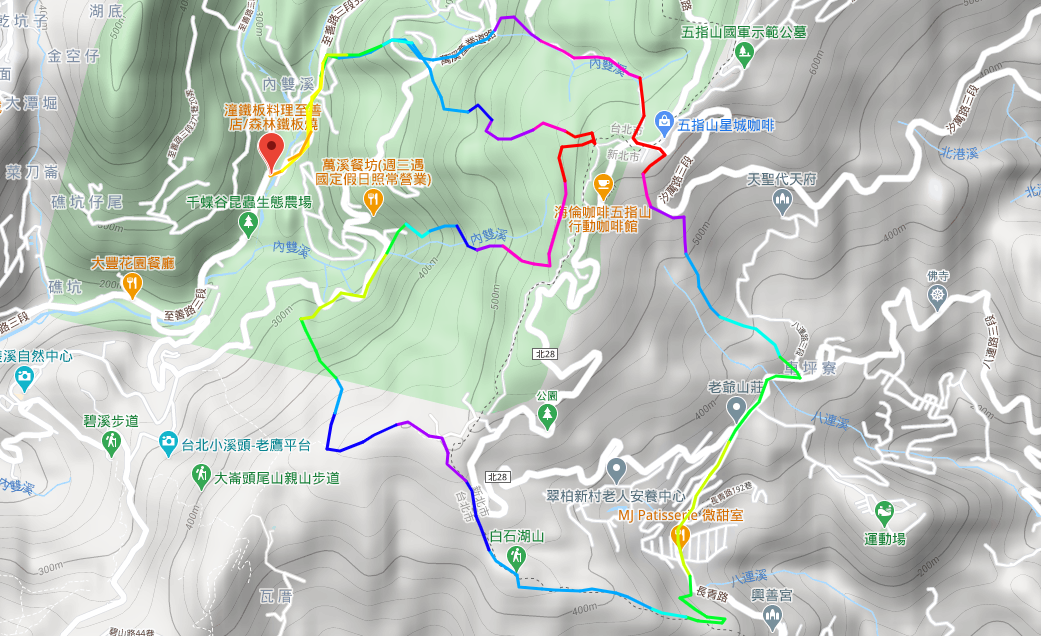 聖人橋 雙溪山在至善路三段336巷的登山口 雙溪山 萬溪產業道路3.8K 萬溪產業道路4.15K 北縱走步道 五指山森林公園 梅花山東南稜 老爺山莊拱門 長青路 長青路 131 巷巷口 大邱田山 白石湖山東峰 白石湖山 碧山 五指山步道 溪山里山山徑與五指山步道叉路口 溪山里山 萬溪產業道路1.98K 萬溪產業道路2.45K 帕米爾公園 雙溪溝古道與帕米爾公園山徑的叉路口 雙溪溝古道 梅花山 梅花山新路 萬溪產業道路 3.75K 雙溪山登山口(萬溪產業道路 3.8K)→ 雙溪山 雙溪山在至善路三段336巷的登山口 聖人橋