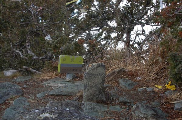 07:37 新康山三角點(H 3331公尺,森林三角點)。有霧,展望不佳;積雪,取消天 宮保壘行程,在此拍照。