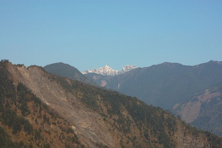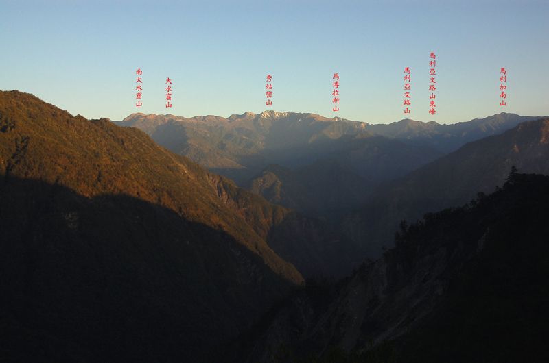08:00 向西北望,穿過拉庫拉庫溪谷,積滿白雪的玉山主、東峰矗立遠方;向右依 序為南大水窟、大水窟、秀姑巒、馬博等山。
