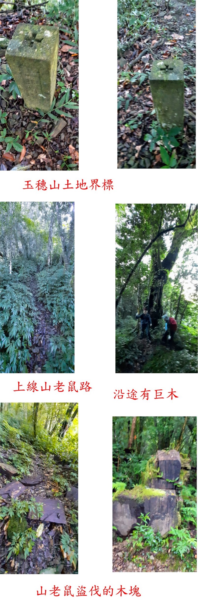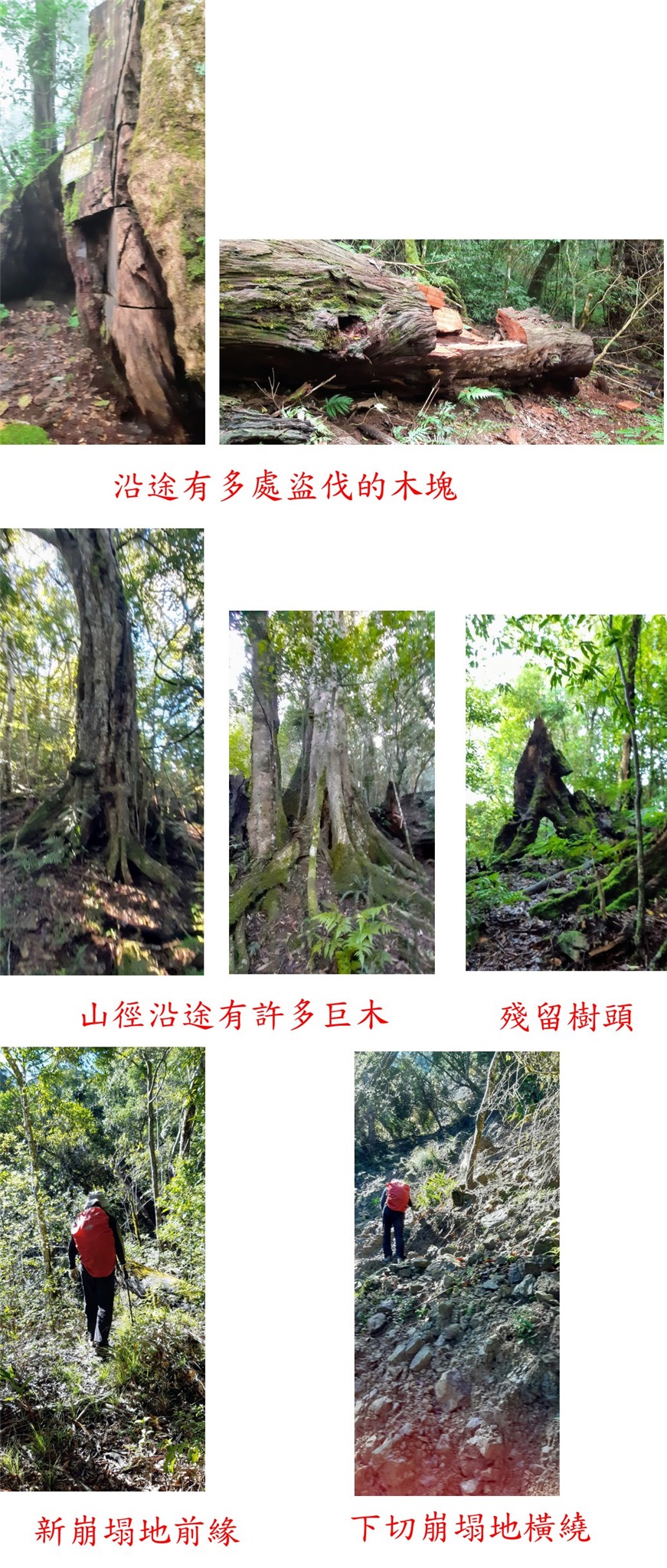 07:39山老鼠叉路,左右線均有路條,往右隨即會接到剛才的下線;取左山老鼠路徑行,走一段路條消失仍有明顯路徑,沿途有多處盜伐的木塊與巨木等。