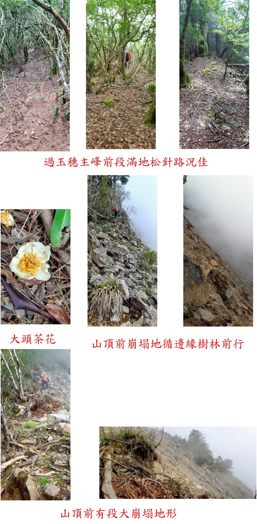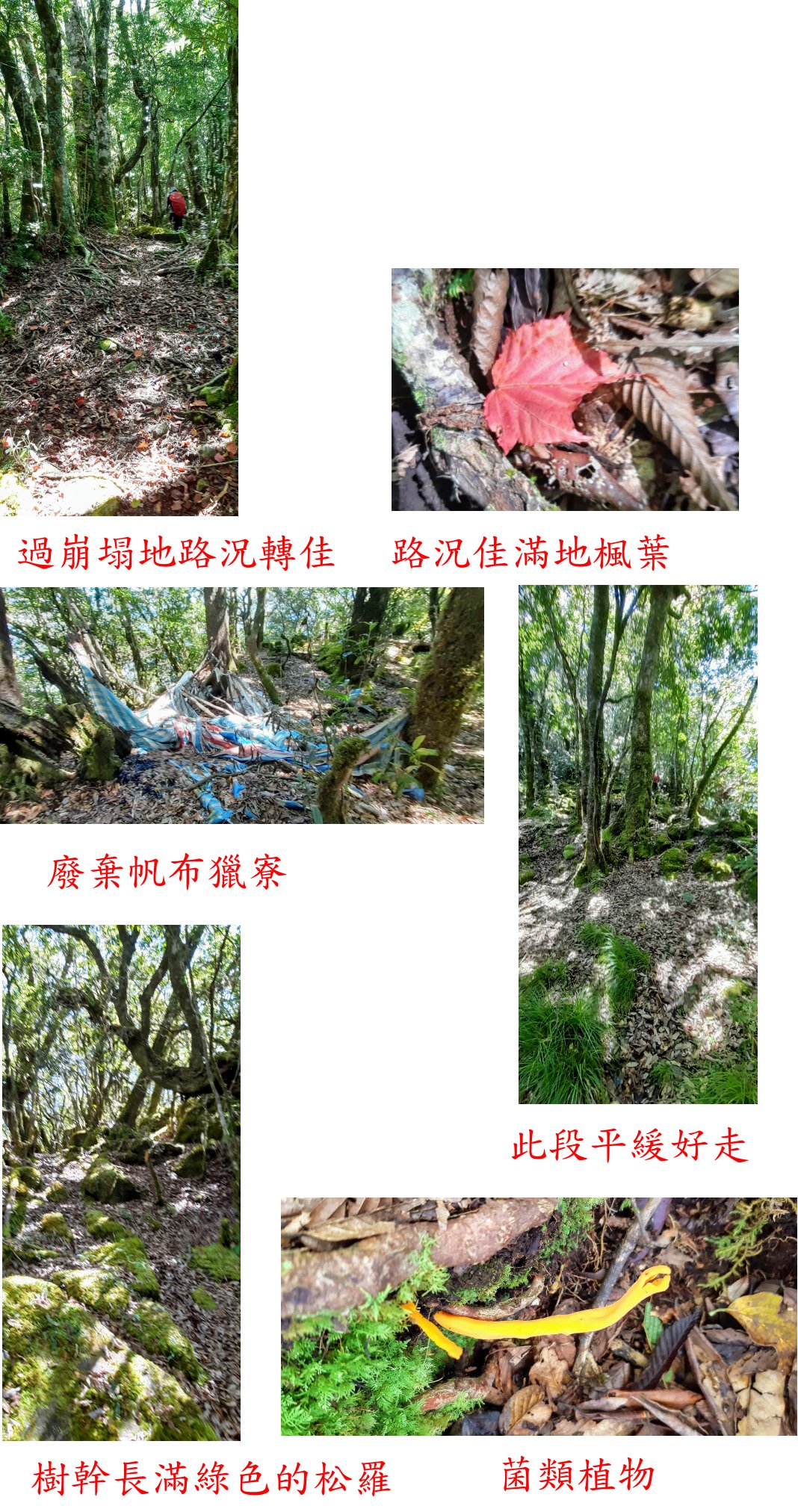12:20崩塌地形,循崩塌地邊緣樹林前行,還在崩塌中舊路已崩塌取左入樹林自行找路,一路陡上大小石塊不太好走前進緩慢;崩塌地應有展望,雲霧裊繞無法遠眺,山頂前有段小芒草。