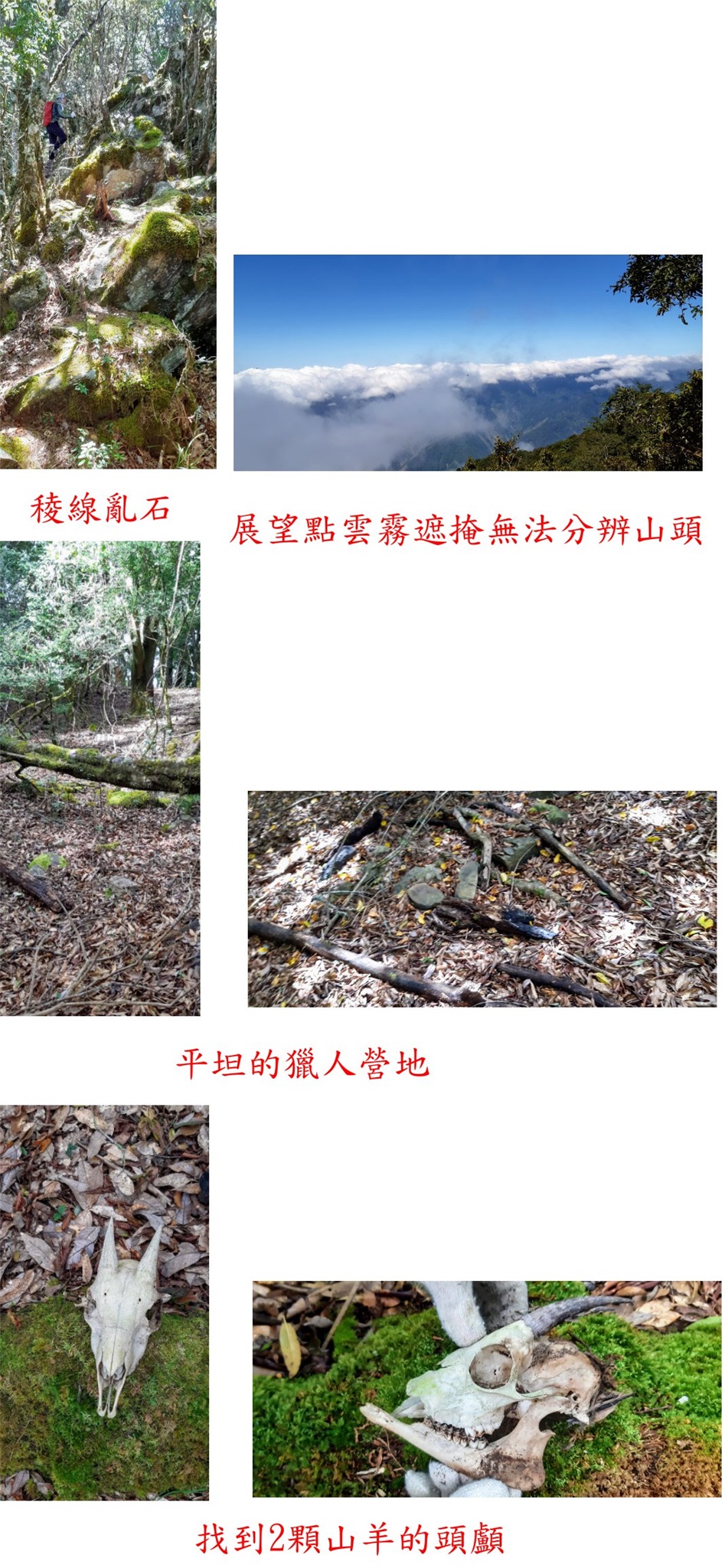 11:06平坦營地,高2435公尺,有舊時獵人炭火餘燼與吊子鋼索等,小楊還找到2顆山羊的頭顱。