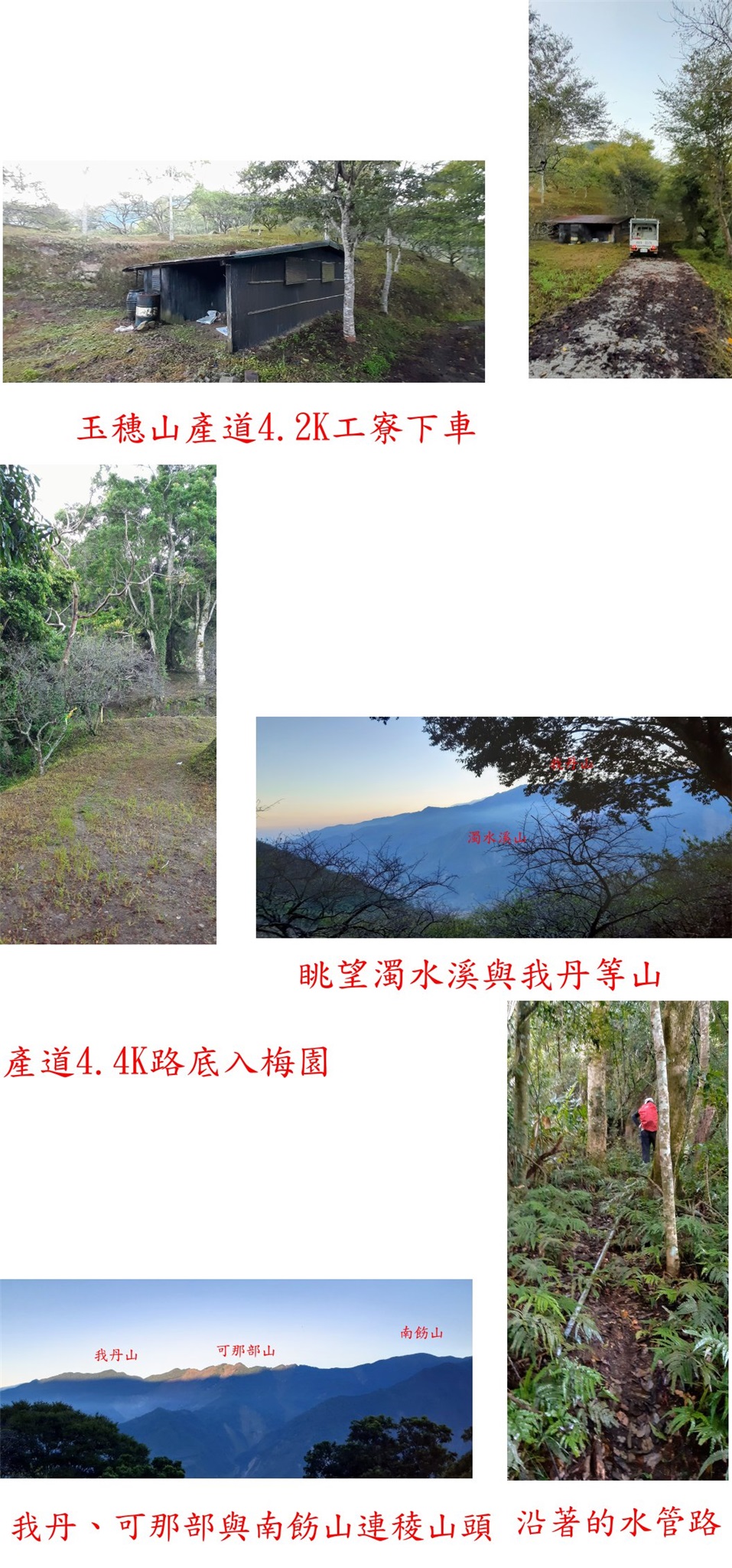 06:02產道4.2K工寮下車,高1234公尺,全程幾乎都是水泥路高底盤應可開上來,我的車應可抵達但搭接駁車輕鬆多了;梅園有間上鎖的工寮,天剛亮西北面曙光剛好照到我丹、可那部與南飭山連稜山頭,還可看到濁水溪與我丹等山。