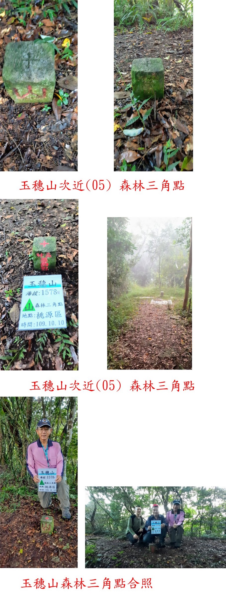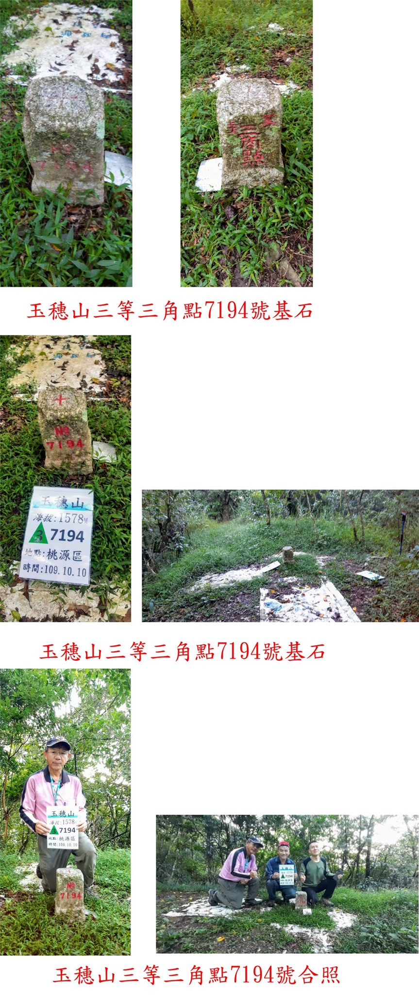 1、玉穗山:位於高雄市桃源區,標高1578公尺,三等三角點7194號與次近(05)森林三角點等2顆基石;座標230543 2566709。