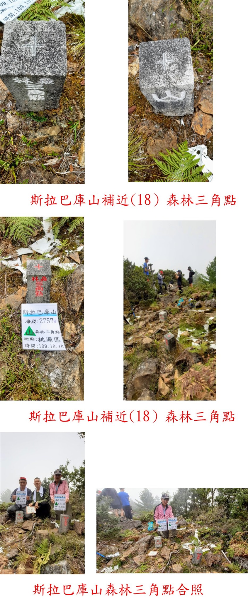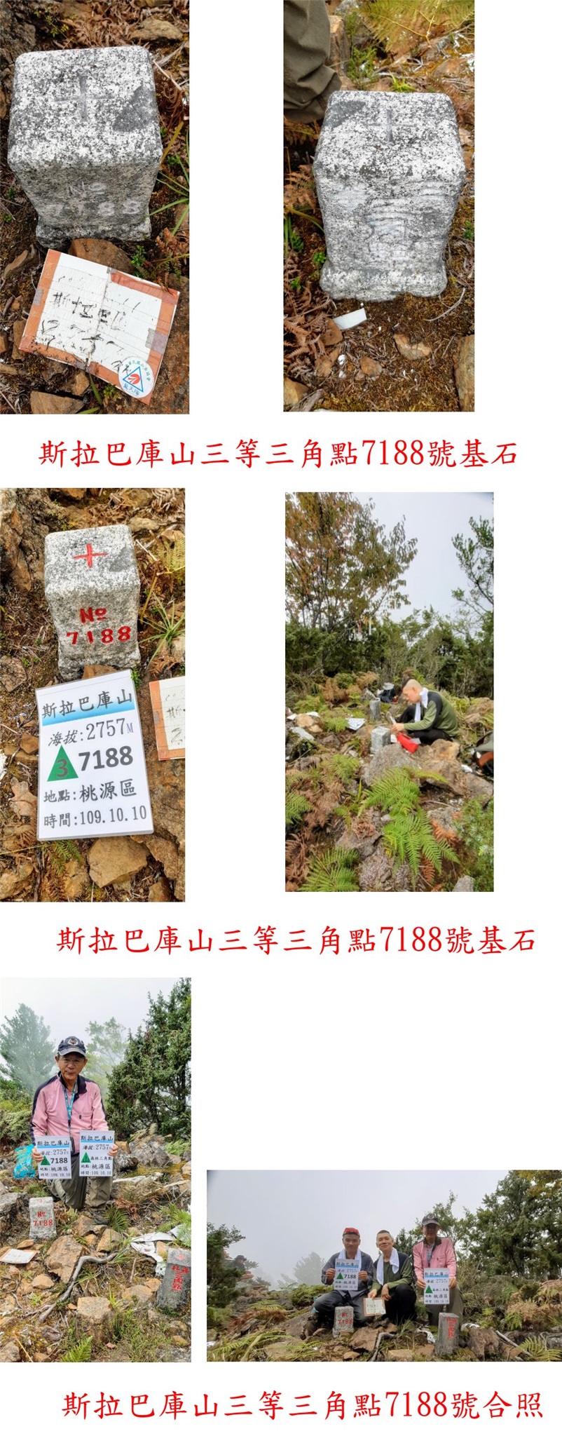 3、斯拉巴庫山:位於高雄市桃源區,標高2757公尺,三等三角點7188號與補近(18)森林三角點等2顆基石;座標233557 2564372。