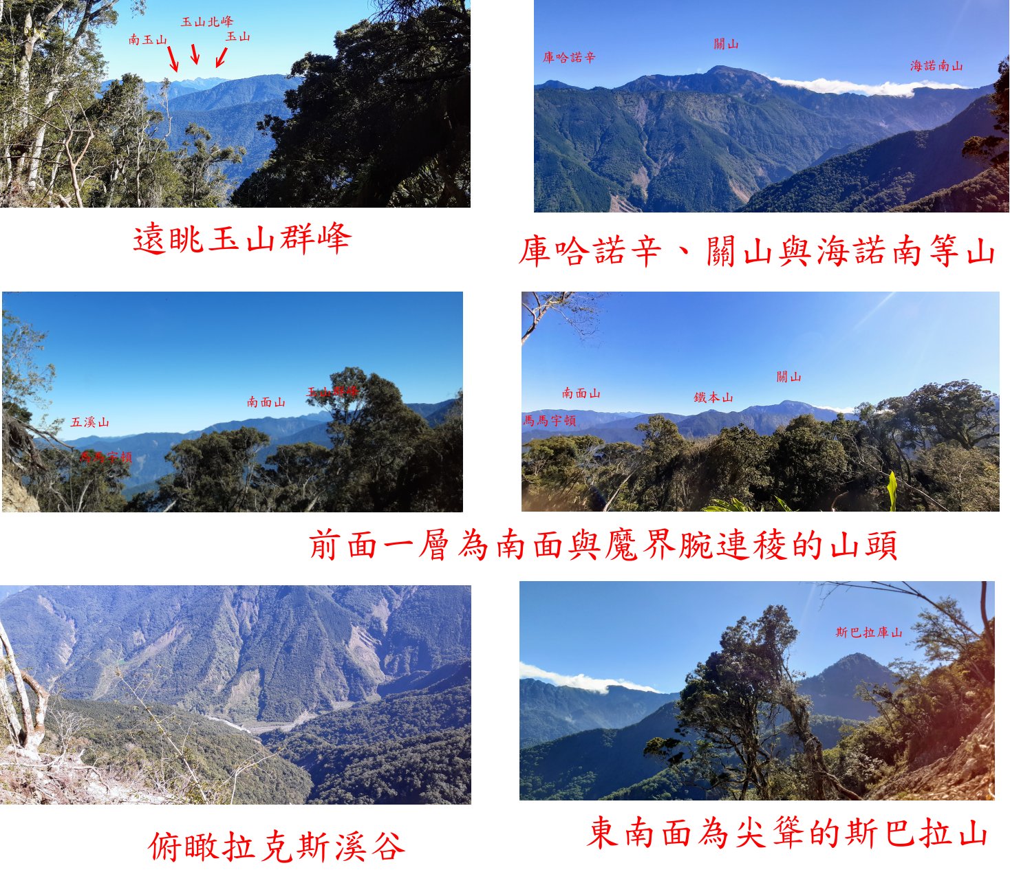09:41絕佳展望點,東面眺望南一段的庫哈諾辛、關山與海諾南等山,東北面遠眺玉山群峰,前面一層為南面與魔界腕連稜的山頭;北面為鐵本山連稜、俯瞰拉克斯溪谷,東南面為尖聳的斯巴拉山。