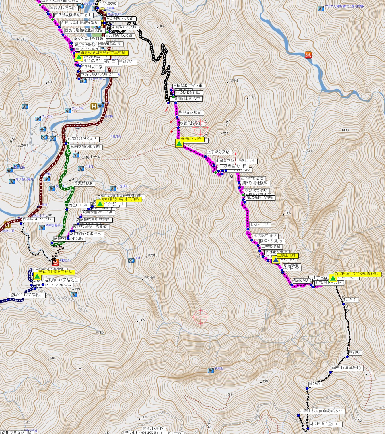 17:55回到路底水塔登山口,孔孟子早我們10分鐘,天色剛好暗下來;下山走4小時又20分鐘,往返費時11小時又49分鐘,新崩塌地找路耽擱不少時間不燃應會更快,此行累計爬升超過