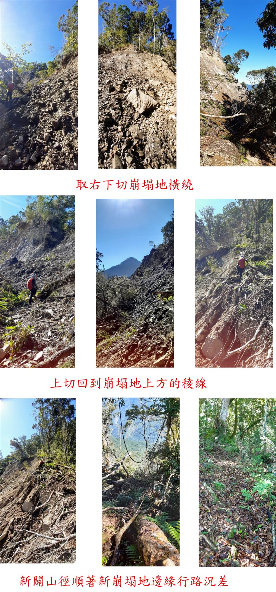08:53新崩塌地,高2014公尺,取右下切崩塌地橫繞,舊紀錄均為提到此崩塌地應為新崩塌,舊時稜線已崩落跟隨舊航跡進入上方滑落下來的樹林,無路條走一小段找不路,退回崩塌地找路。