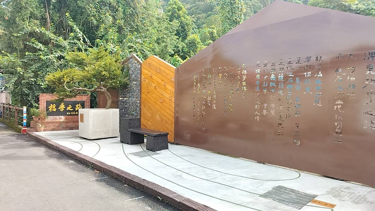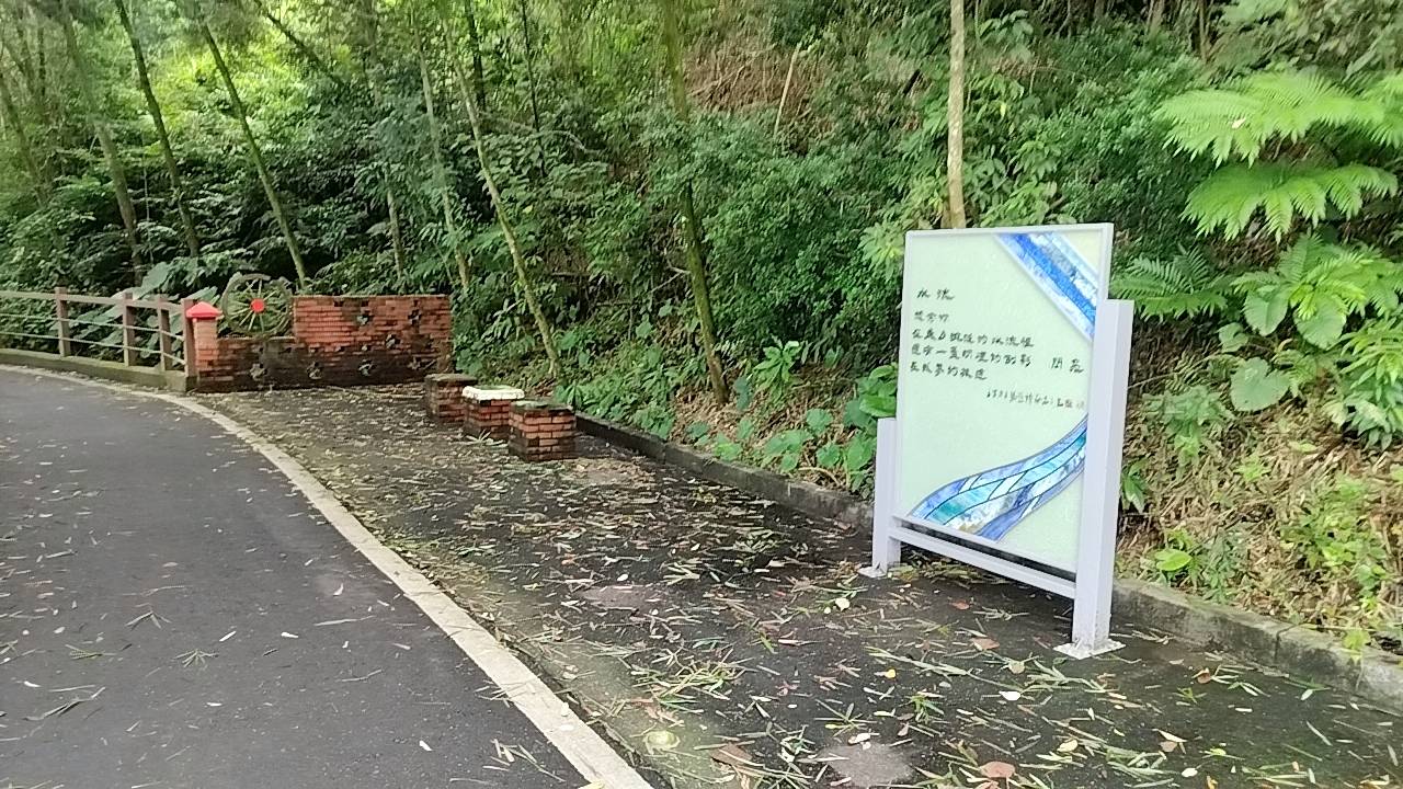 3哲學之路沿水圳旁而行,途中有「水流」「落葉」「陽光」「原鄉」現代詩休息站