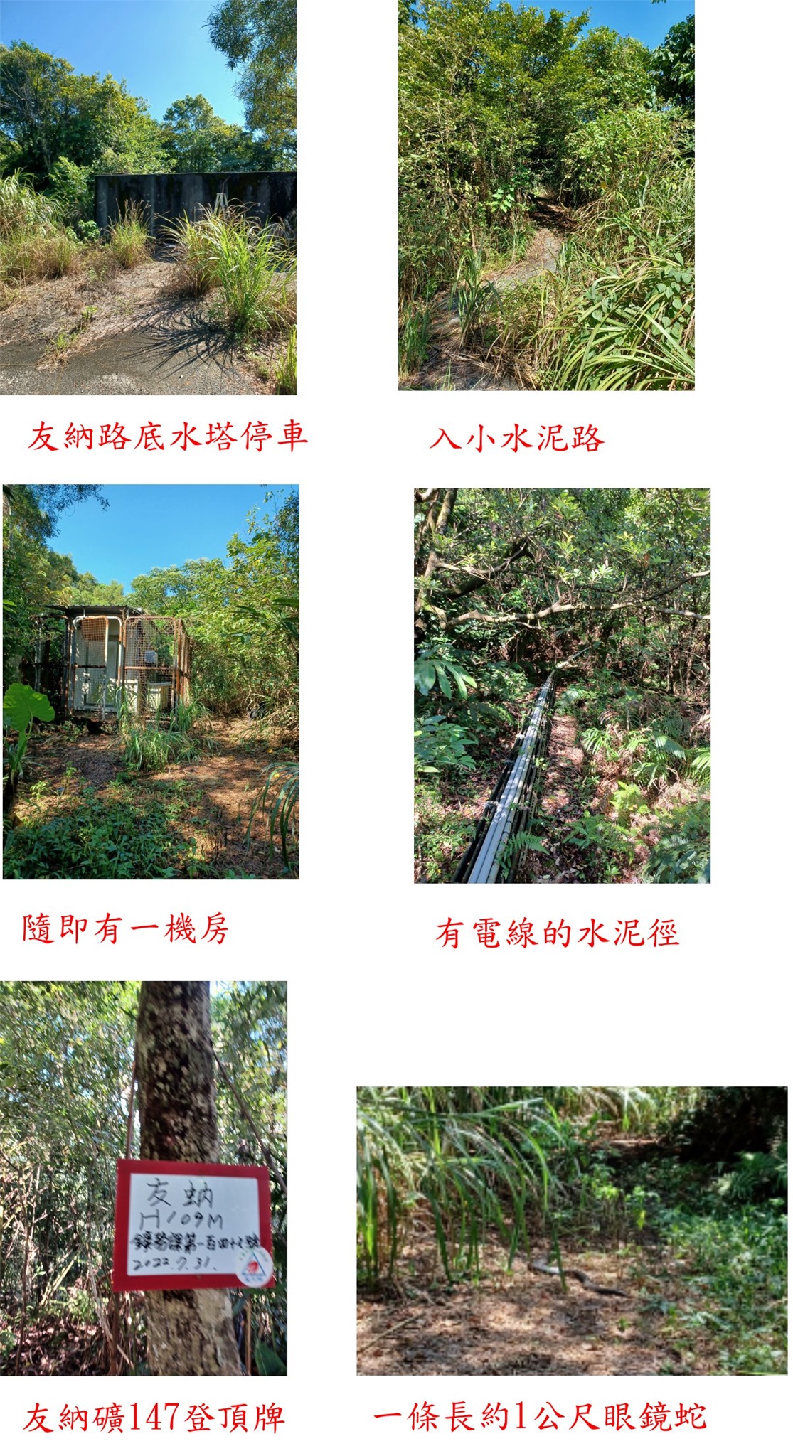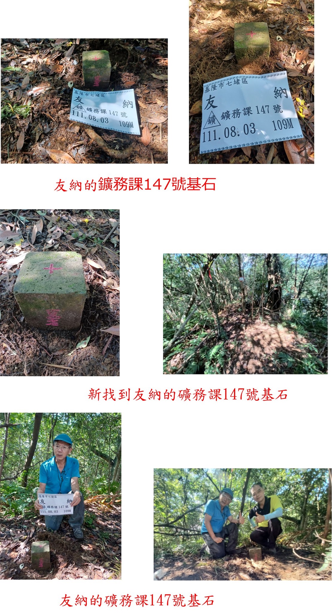 1、友納:位於基隆市七堵區,標高109公尺,鑛務課第147號基石;座標3163832777830。