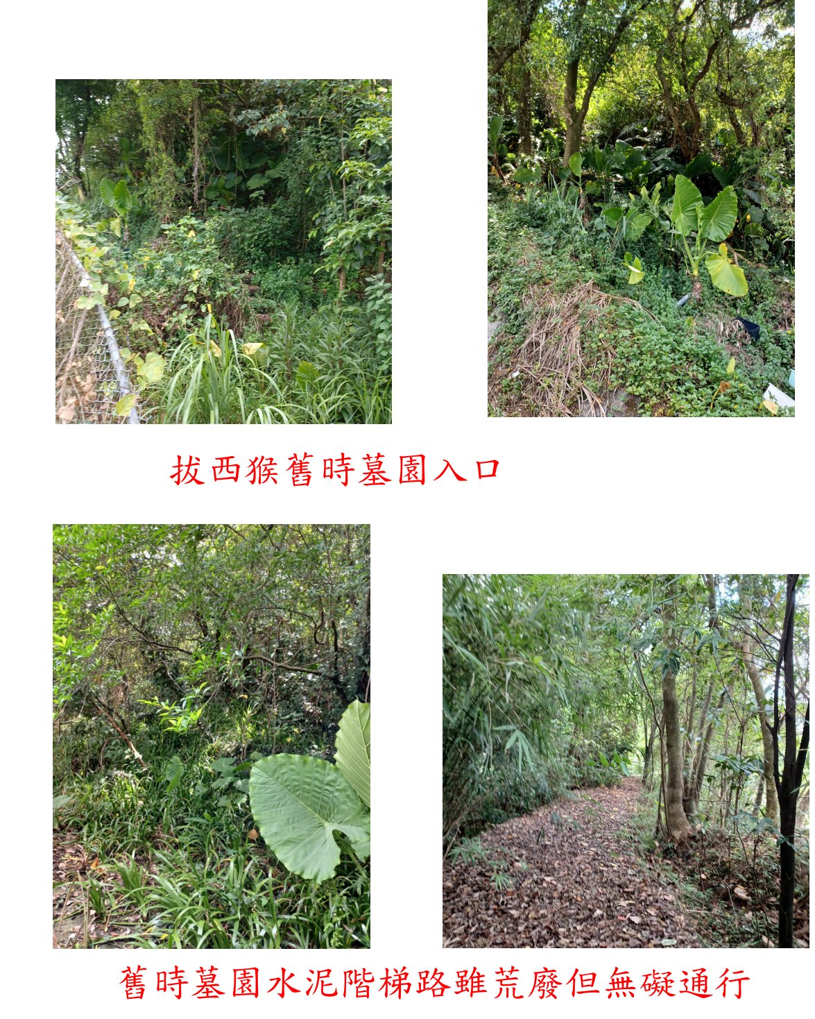取左舊時墓園水泥階梯路上行,雖荒廢但無礙通行沿途有多舊墳,水泥路走約