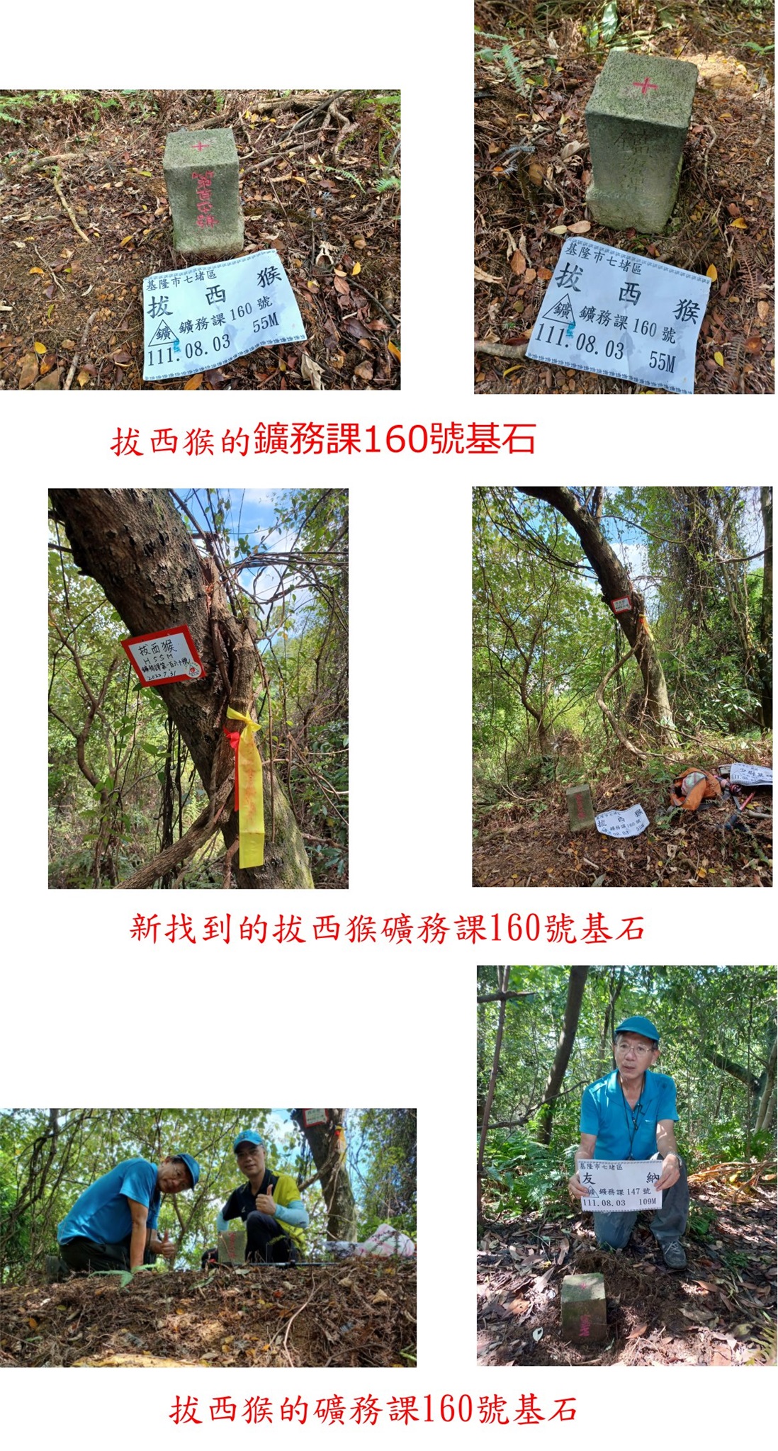 8/3去尋訪山友新找到的2顆鑛務基石,順路去參觀列為歷史建築的五堵鐵路隧道,現整修為自行車道;再來第1顆為友納的鑛務課147號,位於友納的月眉洞附近,去程下錯方向費時27分鐘,如走正路應會快許多;第2顆為拔西猴的鑛務課160號,於中油六堵加油站西南方,走墓園舊時階梯路上山,只要7分鐘即輕鬆入袋;第3座為嚴放寺後山,有基都主08、盛益1號與陸軍用地石柱等3顆基石;最後到基隆市仁愛區,尋訪「陸軍步兵少尉正八位松田篤三之墓」、「新見碑」、「招魂碑」、「招魂碑移建記」、「軍人軍屬火葬場之碑」與「近衛師團戰死者之墓」等6座古石碑,這幾座石碑皆馬關條約(1895年)清廷割讓台灣,日軍佔領台灣的戰爭有關,當時日人為陣亡或病死的將士們立碑為紀;還於古寺廟中,尋獲西國三十三所中觀音石佛其中的幾尊。