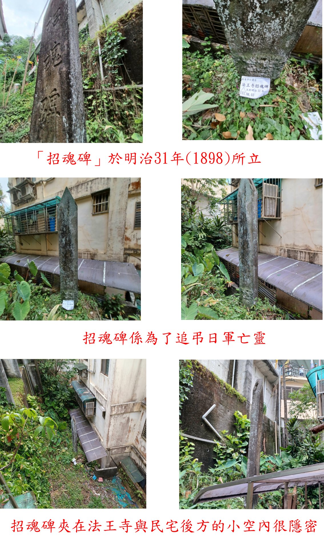 這二塊石碑夾在法王寺與民宅後方的小空內,係主持師父告知方尋獲,於法王寺正殿左下方,要下約2層樓高的斜坡方能抵達,很隱密但也如此方能完整保存迄今;「招魂碑」係為了追弔日軍亡靈,而由當時第4任台灣總督兒玉源太郎於明治31年(1898)所立,石碑為上尖下長方底座有2層,石碑正面刻有「招魂碑」、下署「臺灣總督從三位勳二等功三級陸軍中將男爵兒玉源太郎書」,背面銘刻為「明治三十一年九月建之」、下署「群馬縣前橋市生形政吉刻」;旁另有「招魂碑移建記」,碑文其內容大致為招魂碑原設置在重隆重砲兵隊的營區內,明治42年(1909)移到高砂公園內,此後19年祭祀全絕石碑荒廢,加上公園所處環境成為頑童、狗、豬嬉戲的場所,缺少崇敬之意,所以帝國在鄉軍人會基隆分會憑會員自身的勞力,將招魂碑遷移至現址,工程於昭和元年(1926)