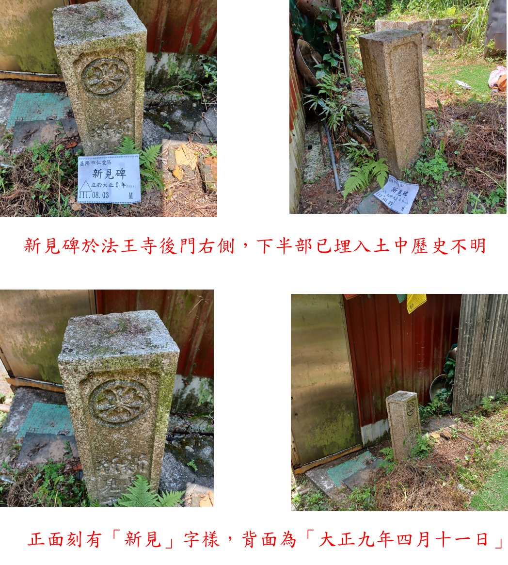2、新見碑:於法王寺後門右側,此碑下半部已埋入土中歷史不明,正面刻有「新見」字樣,背面為「大正九年四月十一日」,上方還有類似菊花的紋飾。