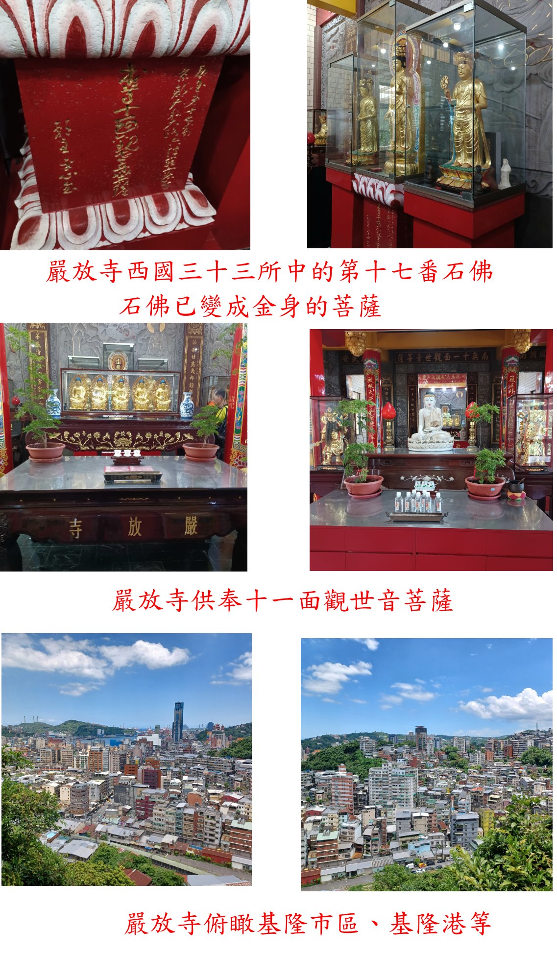 ◎嚴放寺:係日人細川秀吉開採基隆三坑煤礦,於昭和6年(1931)雕刻石像供奉於此,此廟供奉十一面觀世音菩薩,資料應有西國三十三所中3尊觀音石佛,找了很久方發現第十七番(番號與資料不符),石佛已變成金身的菩薩;此廟原為木造建築,因腐蝕脫落呈荒涼景象,於民國59年才由信士郭清榮先生發起重建,主持的師父很熱心介紹。