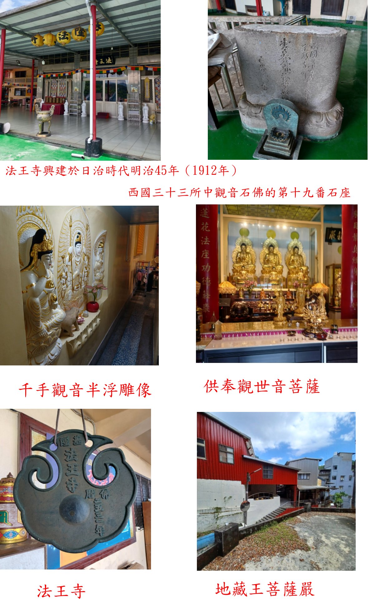 ◎法王寺:興建於日治時代明治45年(1912年),中澤慈愍作為天台宗修驗道的布教所建立,最早奉祀不動明王,於大正9年(1920年)改稱「法王寺」直到現在;當時係專為替火葬場內日軍戰傷病死者的亡靈超拔供養而建,四時誦經,撫慰亡魂,屬日本天台宗,現由生命電視體系接管;主持師父很和善且熱心,帶領參觀了「千手觀音半浮雕像」,另主殿左方還有西國三十三所中觀音石佛的第十九番石座,觀世音菩薩的石佛不見了只剩基座,四周刻字分別為「西國第十九番京都寺町靈麀山行願寺」、「本尊大慈大悲觀世音菩薩」、「第十九番石座」、「三(亡)界萬靈」與「昭和六年十月建之」等字樣。