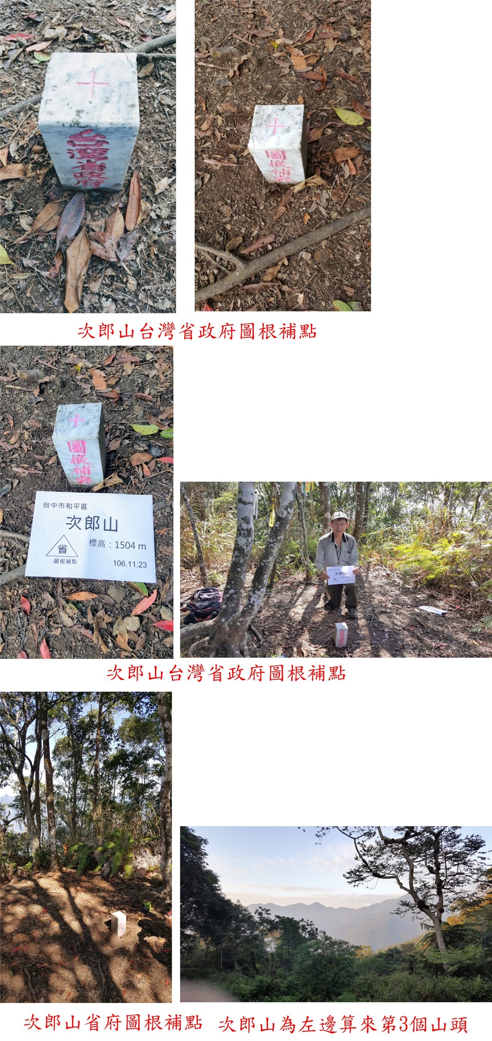 3、次郎山:位於台中市和平區,標高1504公尺,台灣省政府圖根補點;座標241681 2671863。
