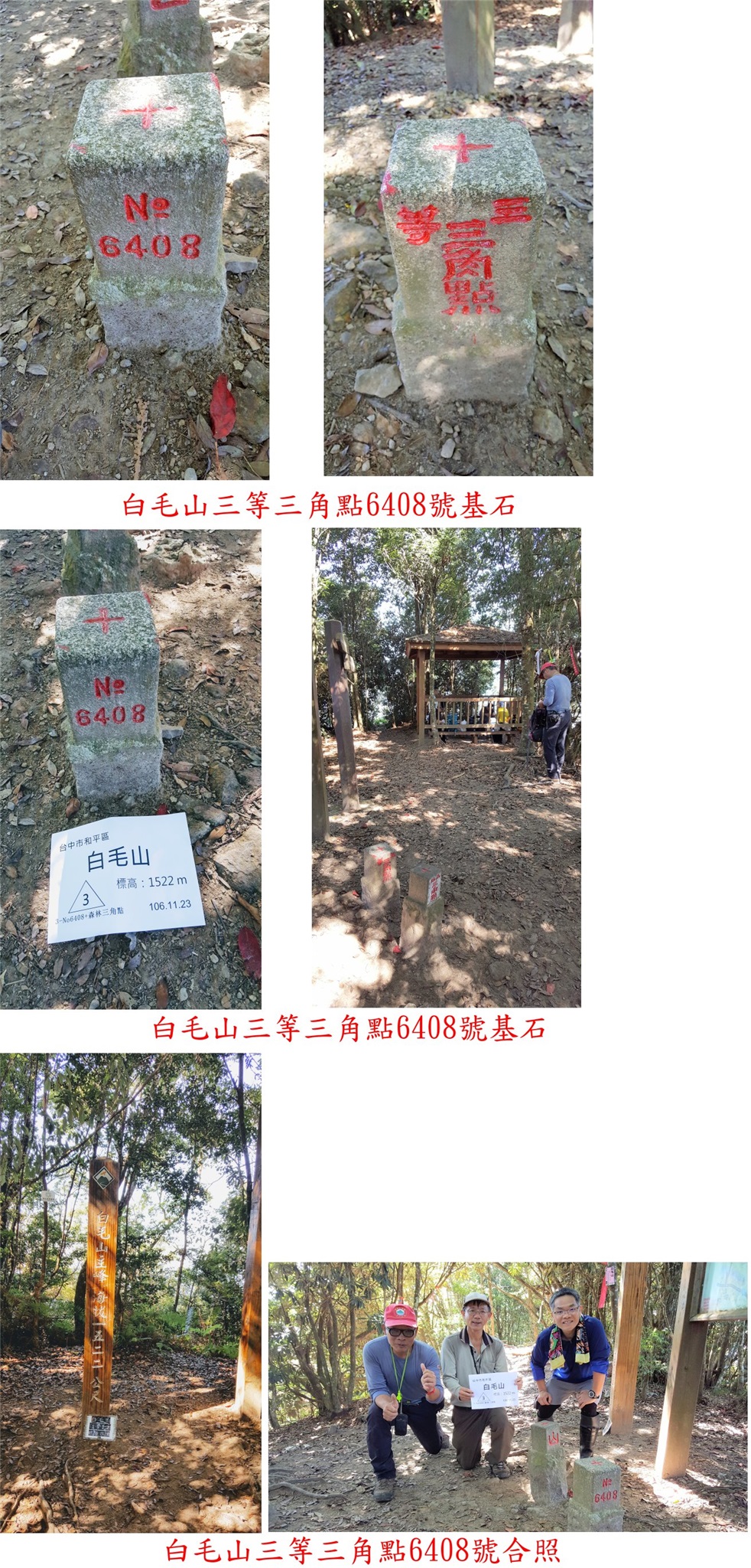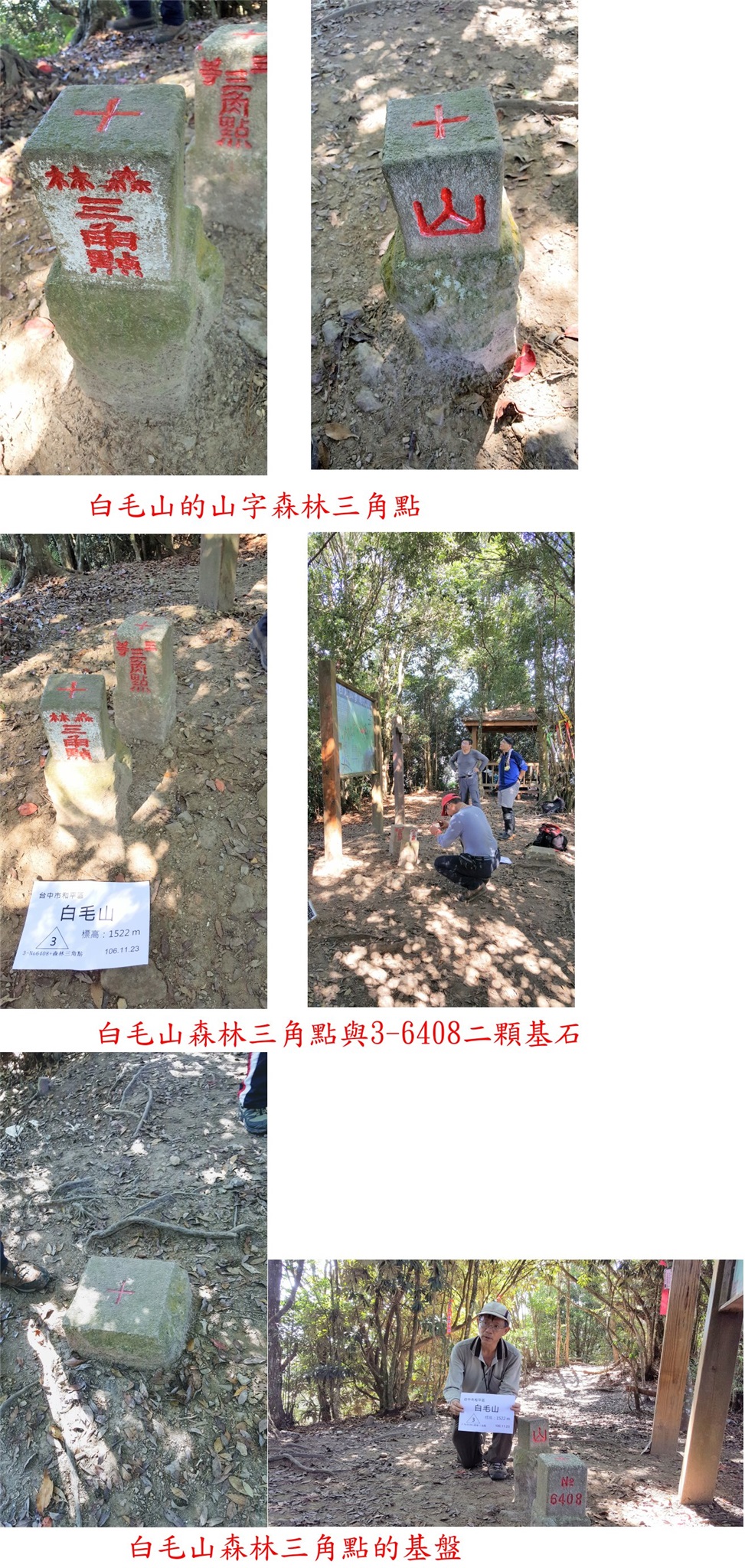 11:19△白毛山,高1516公尺,3-6408號與森林三角點等二顆基石,旁有森林點基盤,此山12年前曾來過;山頂有一登山路線圖,標示此山於步道4.9K處,步道續行出白鹿吊橋登山口,山頂於林內無展望有一涼亭。