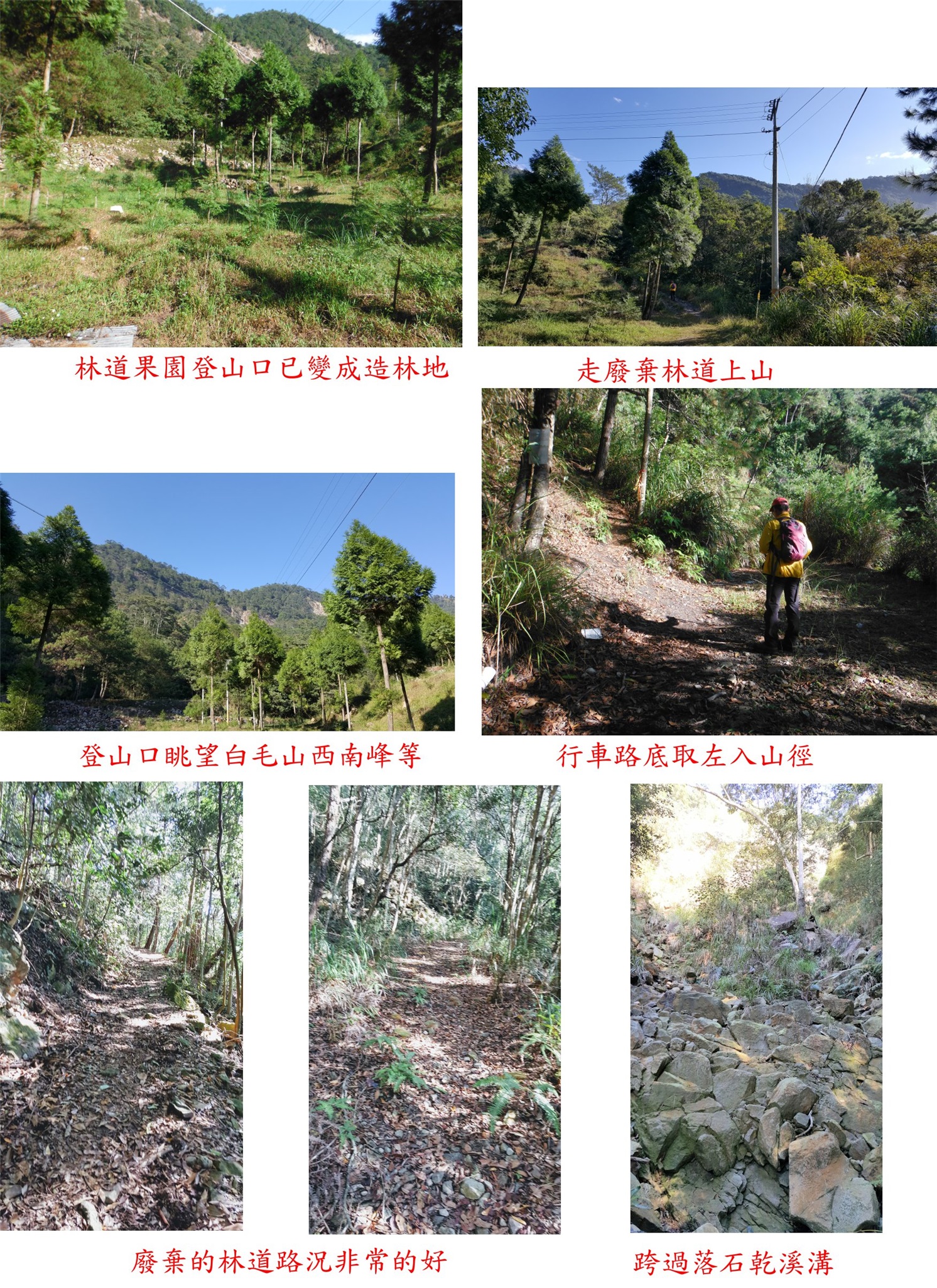 08:49林道約7.8K舊時的果園登山口停車,高1025公尺,果園已被林務局收回改為造林地,工寮且已拆除;眺望左上方的白毛山西南峰,前方為白毛山連稜。